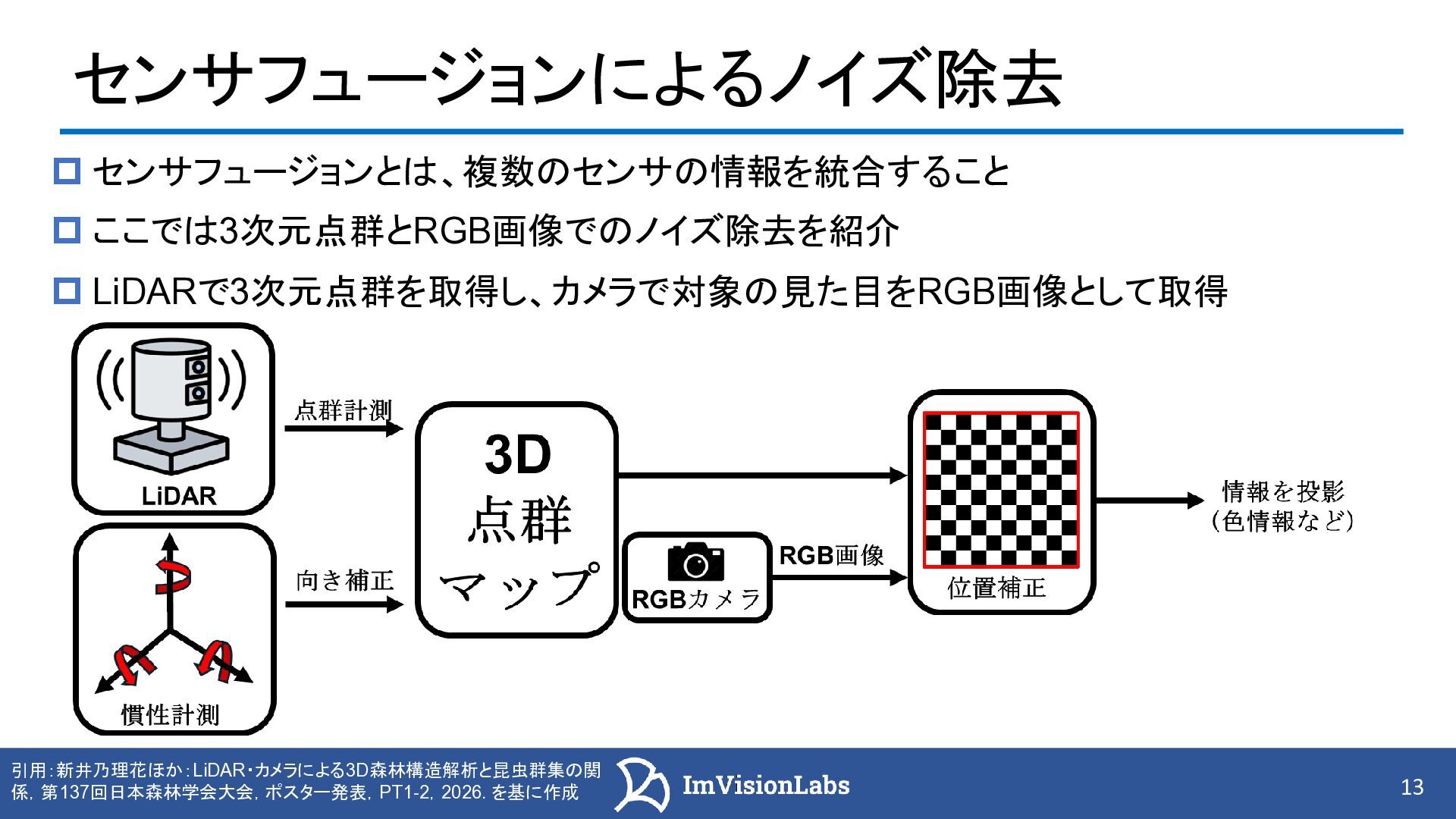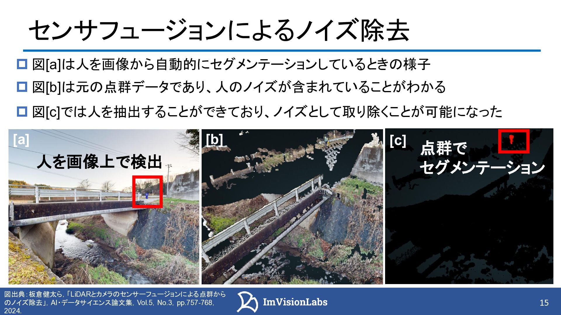 3 次元点群データを活用した インフラ構造物の維持管理 https://www.jstage.jst.go.jp/article/jjspe/85/3/85_228/_pdf 広範囲の構造物を高速・高精度に計測できる 測量・点検・異常検知等の多くの項目にて、業務の効率化が期待されている(図[b]) [a]レーザースキャナを搭載した MMS車両の例 引用:国土交通省「3次元点群データを用いた効率的な管理手法の開発」(2025), https://www.mlit.go.jp/tetudo/content/001709172.pdf [b]点群による壁面のひび割れ検出。 白い線がひびを表している 2