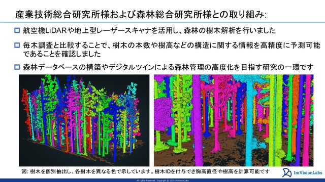産業技術総合研究所様と航空機LiDARや地上型レーザースキャナを活用し、森林の樹木解析を行いました。毎木調査と比較することで、樹木の本数や樹高などの構造に関する情報を高精度に予測可能であることを確認しました。森林データベースの構築やデジタルツインによる森林管理の高度化を目指す研究の一環となります。