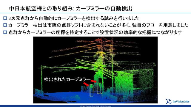 中日本航空様と3次元点群から自動的にカーブミラーを検出する試みを行いました。 カーブミラー抽出は市販の点群ソフトに含まれないことが多く、独自のフローを用意しました。 点群からカーブミラーの座標を特定することで設置状況の効率的な把握につながります。