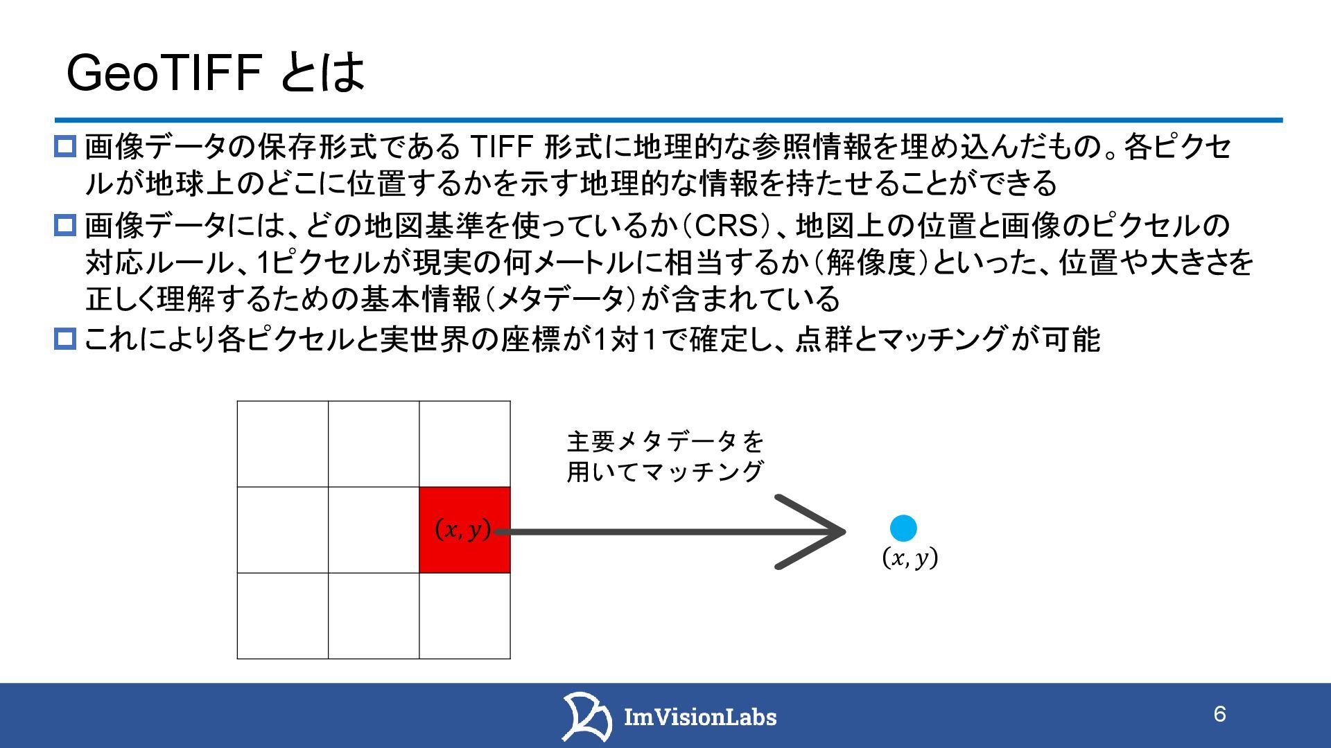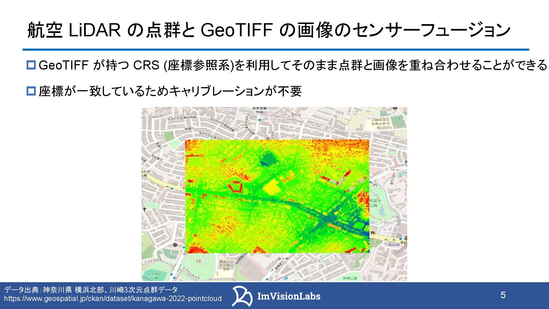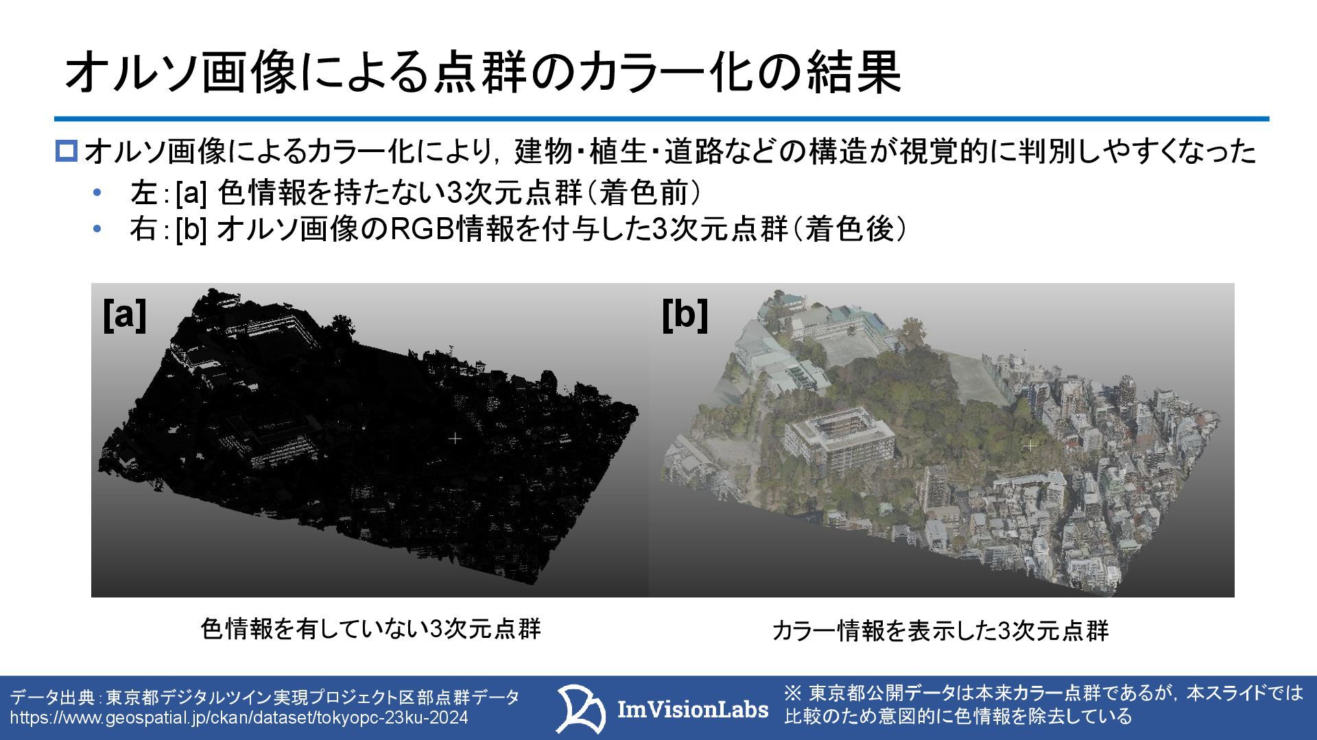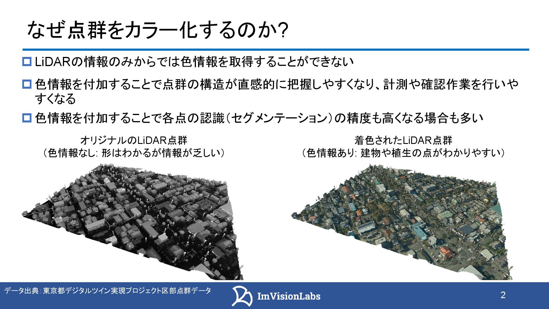 本資料は、2026/1/14開催のオンライン勉強会(AIMTG)にて発表した内容をまとめたものです。 LiDAR 点群にオルソ画像の情報を融合することで視認性や分類性能を紹介しています。