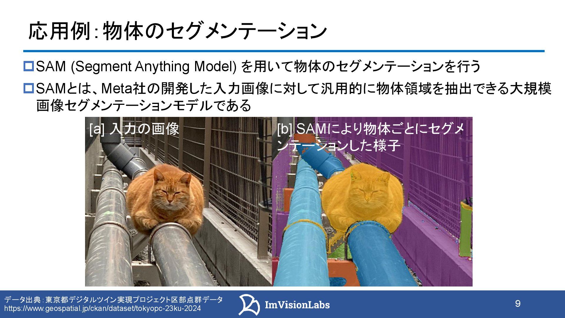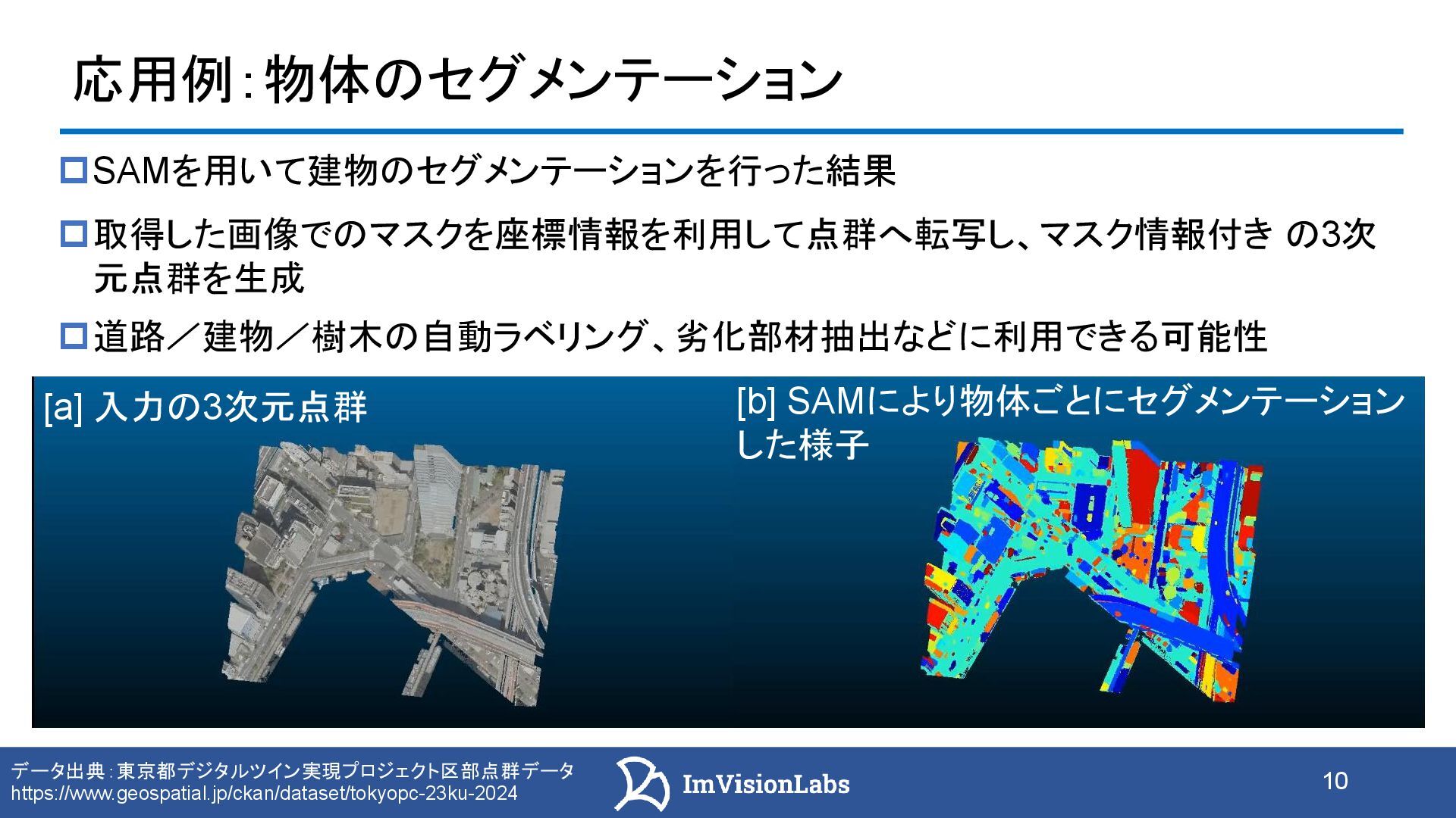 主な内容: LiDAR 点群の色情報付与の意義と活用例 オルソ画像情報を点群に反映する手法 セグメンテーション(SAM)を用いた物体抽出と点群への反映