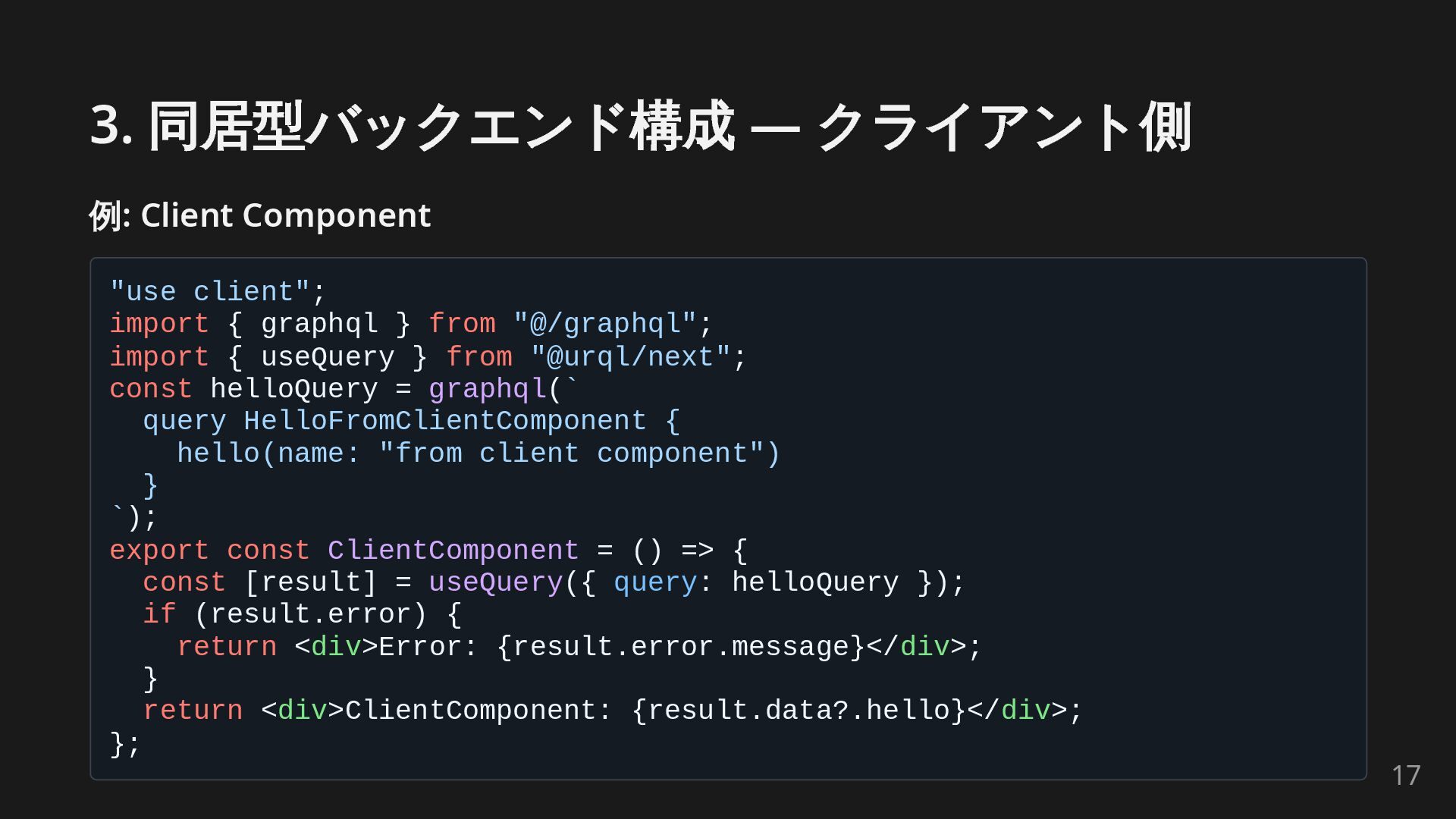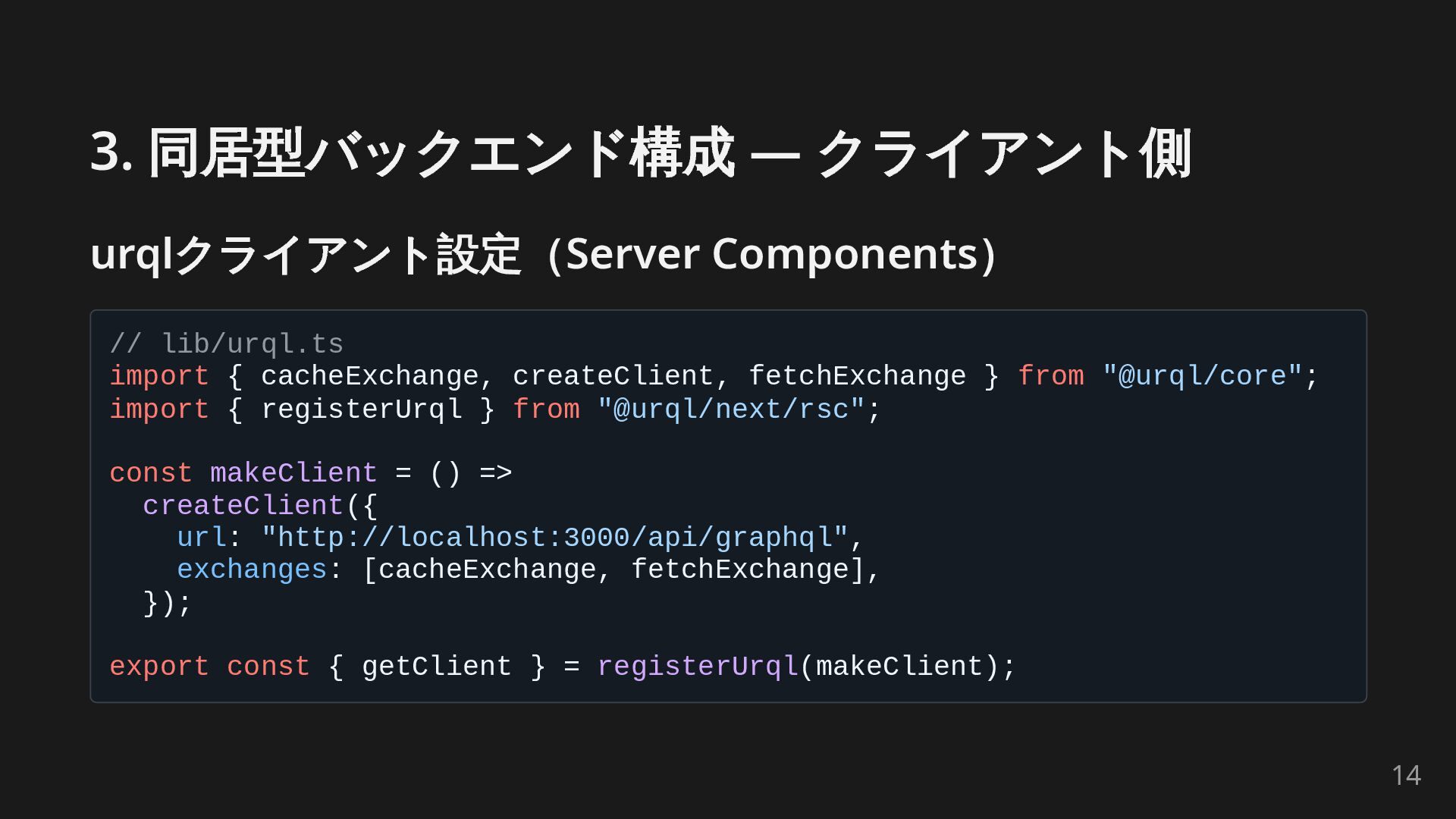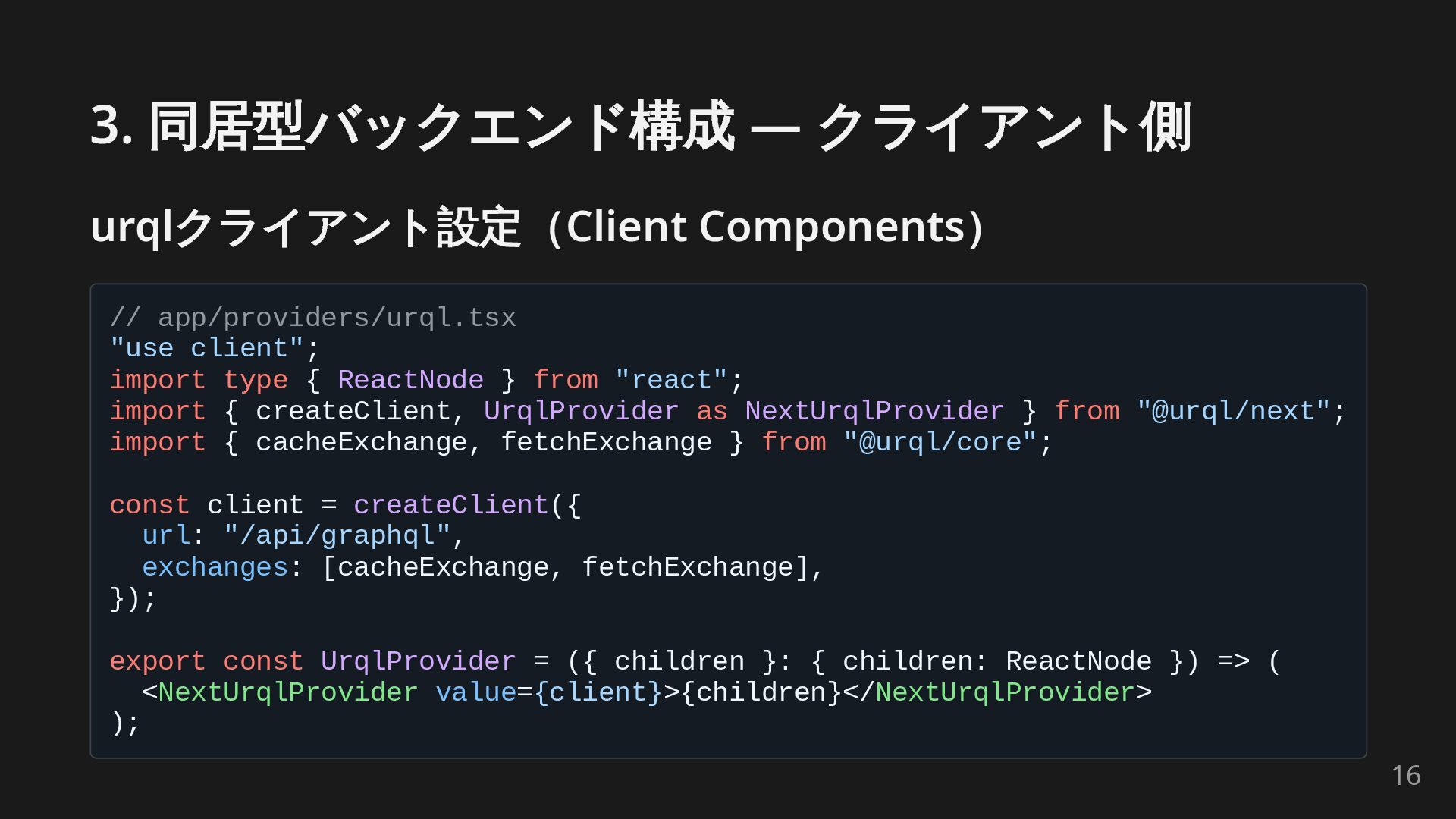 import type { ReactNode } from "react"; import { createClient, UrqlProvider as NextUrqlProvider } from "@urql/next"; import { cacheExchange, fetchExchange } from "@urql/core"; const client = createClient({ url: "/api/graphql", exchanges: [cacheExchange, fetchExchange], }); export const UrqlProvider = ({ children }: { children: ReactNode }) => ( <NextUrqlProvider value={client}>{children}</NextUrqlProvider> ); 16