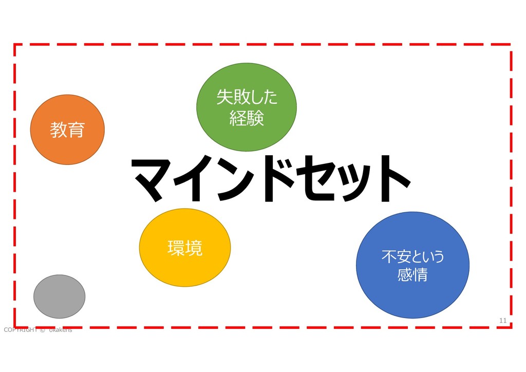 マインドセットとは、経験、教育、先入観などから形成される思考様式、心理状態。 暗黙の了解事項、思い込み(パラダイム)、価値観、信念などがこれに含まれる。 マインドセットという言い方は、人の意識や心理状態は一面的なとらえ方はできず、多面的に見 てセットしたものがマインドの全体像を表しているということから来ている。 企業のマインドセットは、その企業の戦略、組織構成、ビジョン、歴史、扱っている製品やサービ スの特性、経営スタイル、求められているスキル、情報の流れ、コミュニケーションなどによって形成 される。