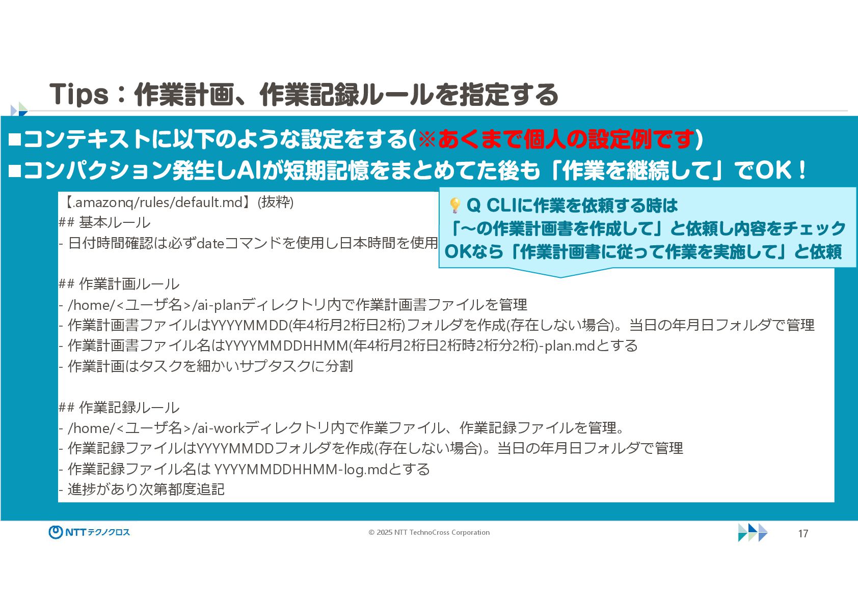 © 2025 NTT TechnoCross Corporation 17 【.amazonq/rules/default.md】(抜粋) ##