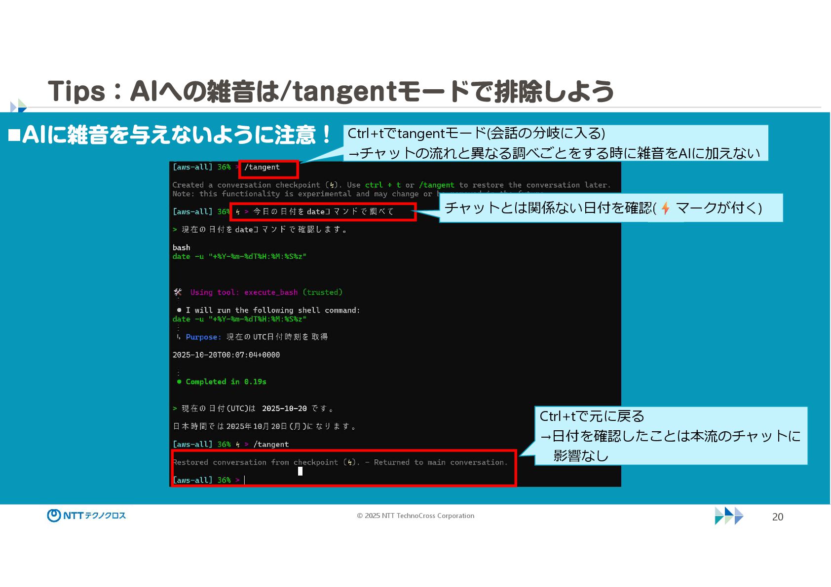 © 2025 NTT TechnoCross Corporation 20 Ctrl+tで元に戻る →日付を確認したことは本流のチャットに 影響なし