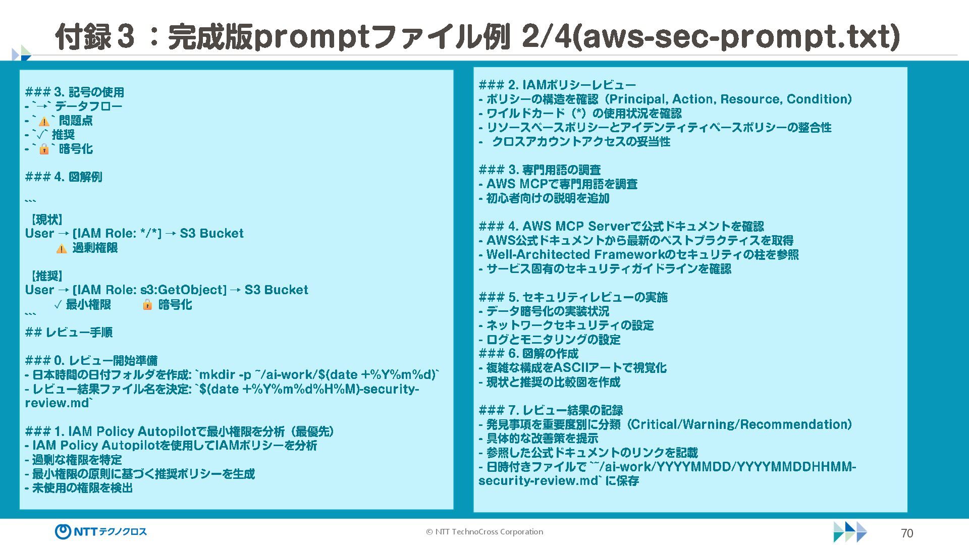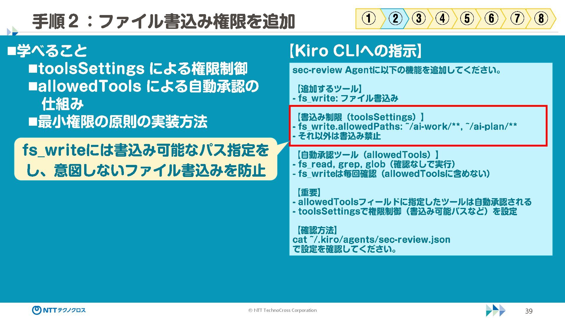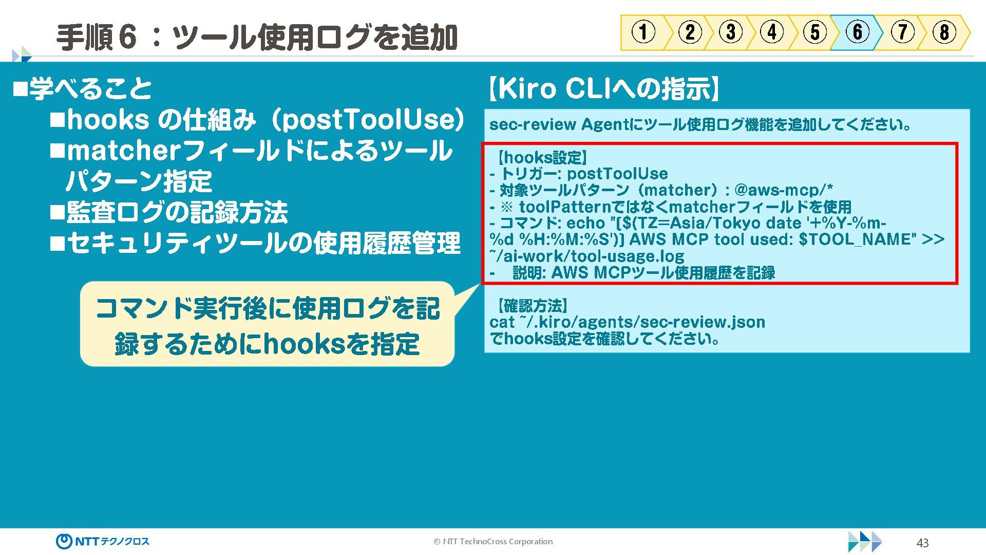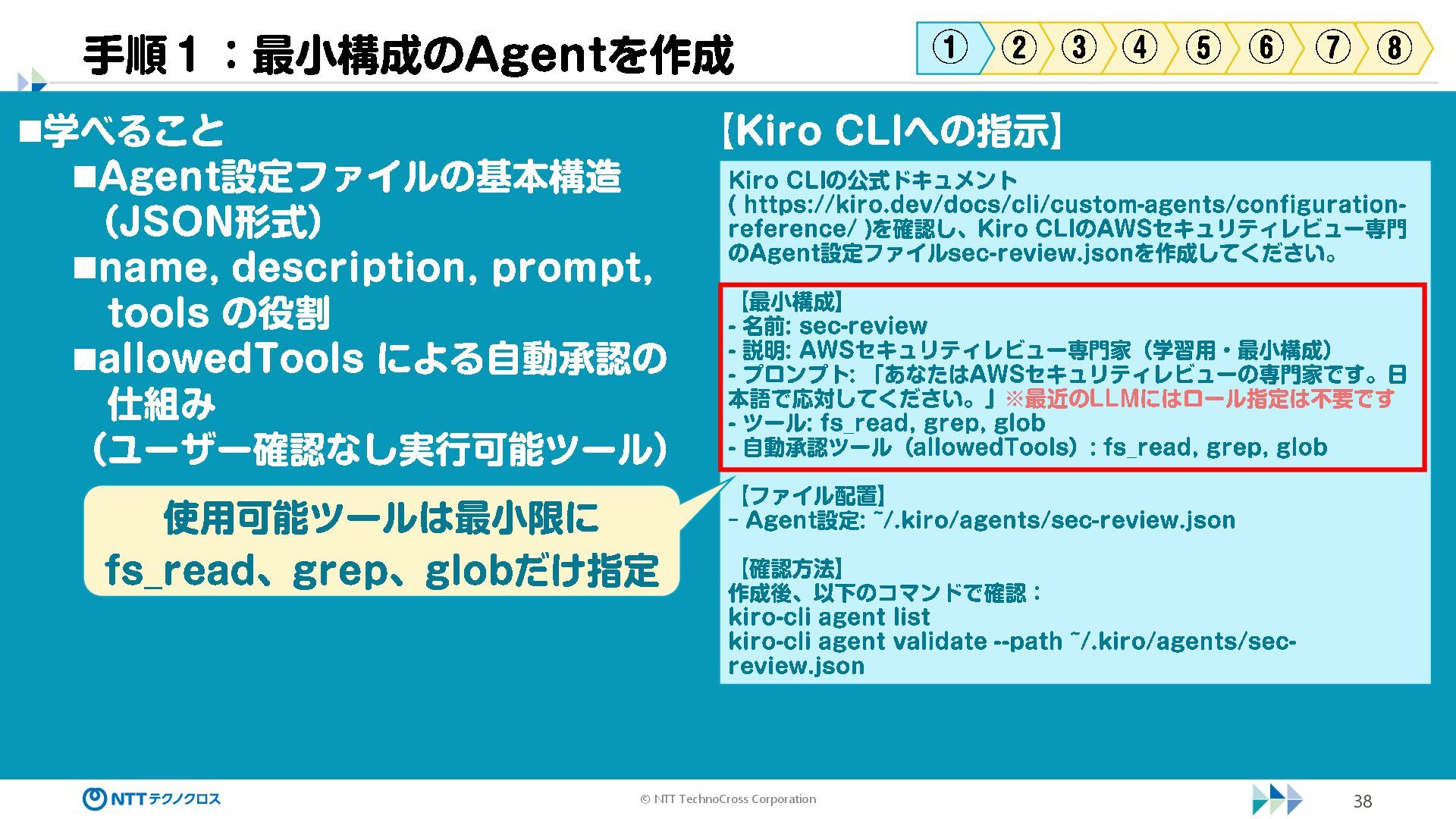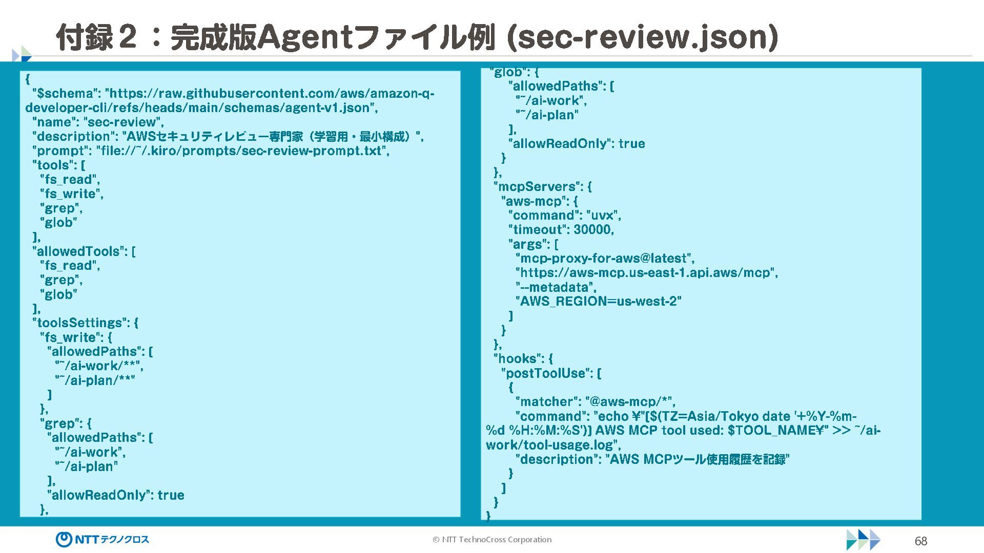 (sec -review.json) "glob": { "allowedPaths": [ "~/ai -work", "~/ai -plan" ], "allowReadOnly": true } }, "mcpServers": { "aws -mcp": { "command": "uvx", "timeout": 30000, "args": [ "mcp -proxy -for -aws@latest", "https://aws -mcp.us -east -1.api.aws/mcp", "-- metadata", "AWS_REGION=us -west -2" ] } }, "hooks": { "postToolUse": [ { "matcher": "@aws -mcp/*", "command": "echo ¥ "[$(TZ=Asia/Tokyo date '+%Y -%m - %d %H:%M:%S')] AWS MCP tool used: $TOOL_NAME ¥ " >> ~/ai - work/tool -usage.log", "description": "AWS MCP ツール使用履歴を記録 " } ] } } { "$schema": "https://raw.githubusercontent.com/aws/amazon -q - developer -cli/refs/heads/main/schemas/agent -v1.json", "name": "sec -review", "description": "AWS セキュリティレビュー専門家(学習用・最小構成) ", "prompt": "file://~/.kiro/prompts/sec -review -prompt.txt", "tools": [ "fs_read", "fs_write", "grep", "glob" ], "allowedTools": [ "fs_read", "grep", "glob" ], "toolsSettings": { "fs_write": { "allowedPaths": [ "~/ai -work/**", "~/ai -plan/**" ] }, "grep": { "allowedPaths": [ "~/ai -work", "~/ai -plan" ], "allowReadOnly": true },