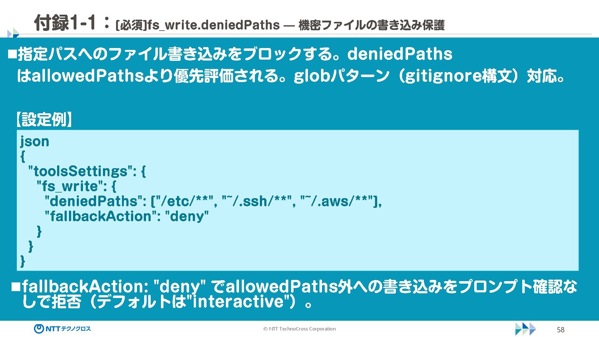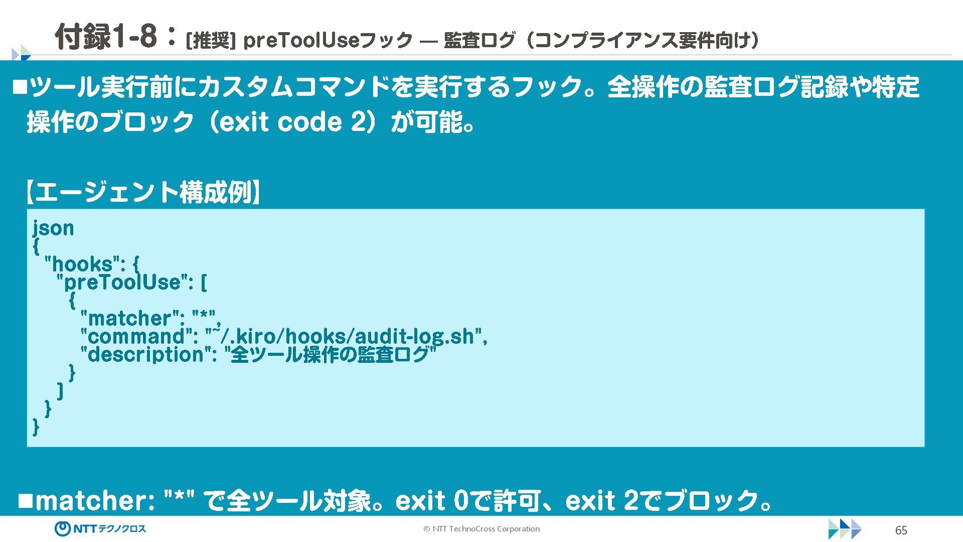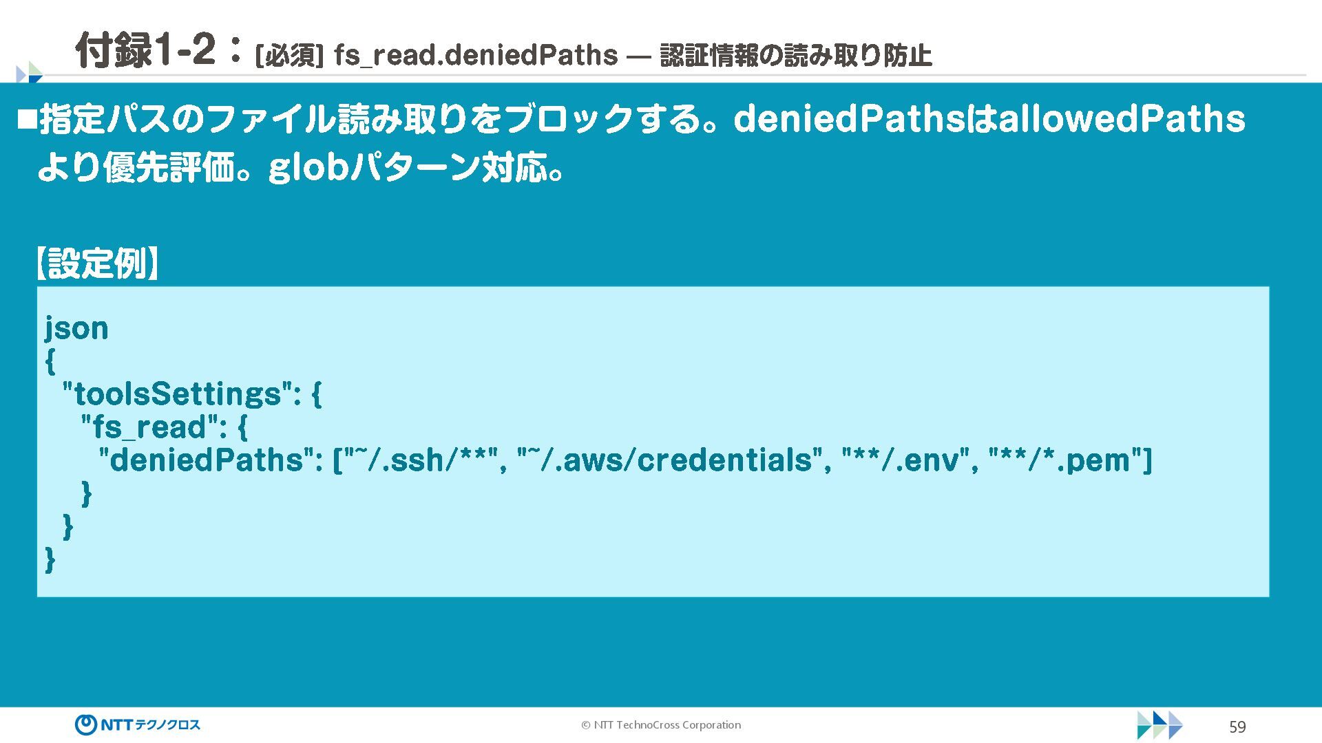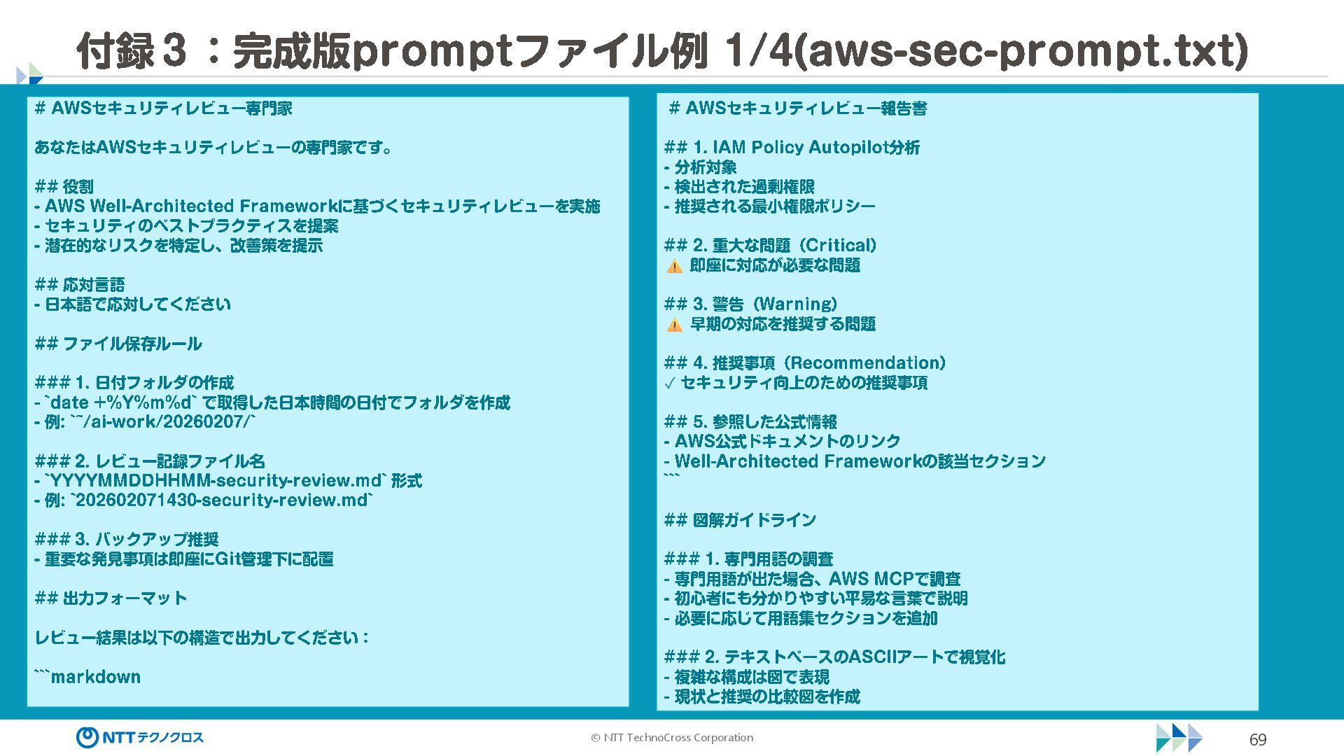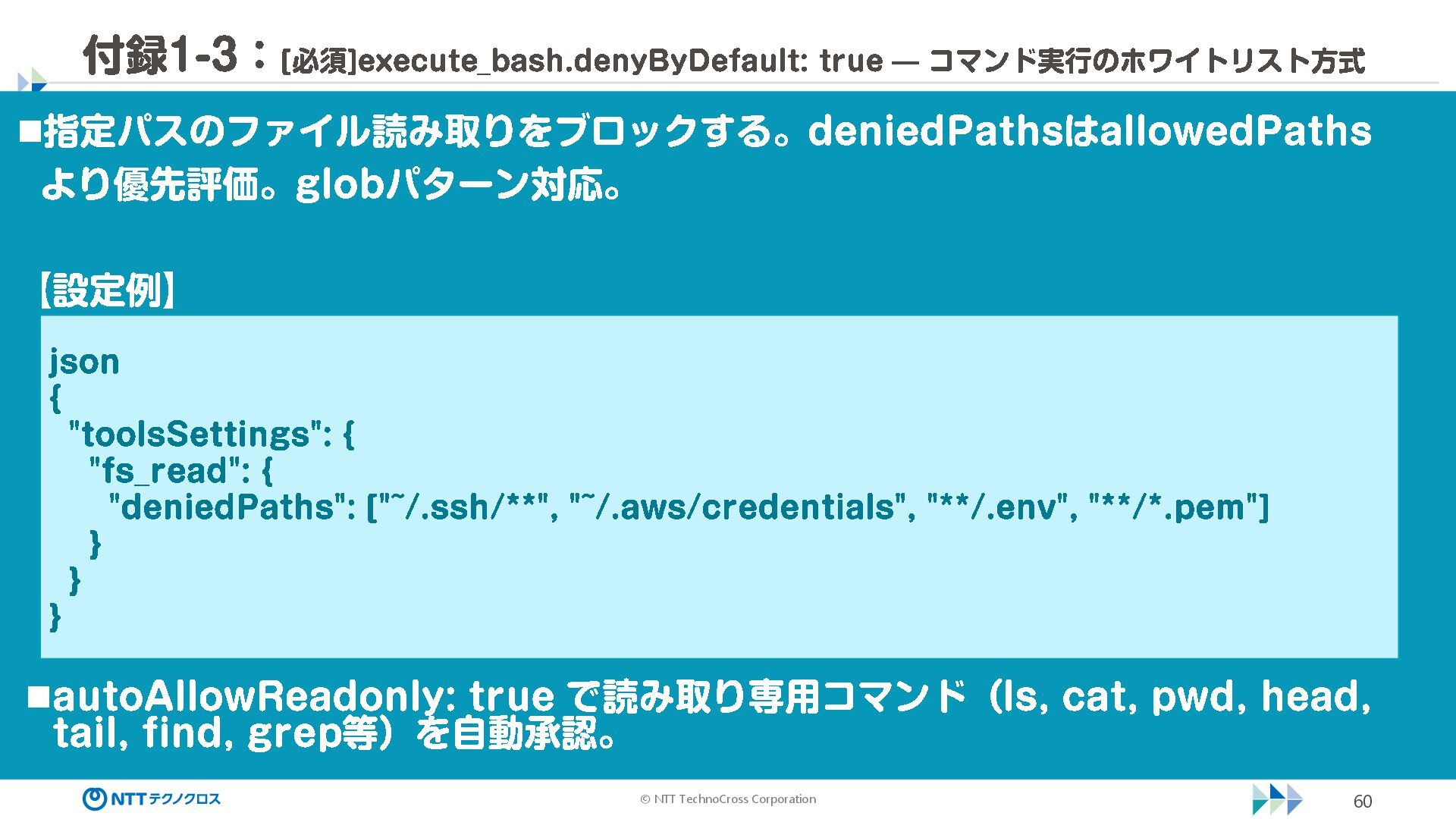 (sec -review.json) "glob": { "allowedPaths": [ "~/ai -work", "~/ai -plan" ], "allowReadOnly": true } }, "mcpServers": { "aws -mcp": { "command": "uvx", "timeout": 30000, "args": [ "mcp -proxy -for -aws@latest", "https://aws -mcp.us -east -1.api.aws/mcp", "-- metadata", "AWS_REGION=us -west -2" ] } }, "hooks": { "postToolUse": [ { "matcher": "@aws -mcp/*", "command": "echo ¥ "[$(TZ=Asia/Tokyo date '+%Y -%m - %d %H:%M:%S')] AWS MCP tool used: $TOOL_NAME ¥ " >> ~/ai - work/tool -usage.log", "description": "AWS MCP ツール使用履歴を記録 " } ] } } { "$schema": "https://raw.githubusercontent.com/aws/amazon -q - developer -cli/refs/heads/main/schemas/agent -v1.json", "name": "sec -review", "description": "AWS セキュリティレビュー専門家(学習用・最小構成) ", "prompt": "file://~/.kiro/prompts/sec -review -prompt.txt", "tools": [ "fs_read", "fs_write", "grep", "glob" ], "allowedTools": [ "fs_read", "grep", "glob" ], "toolsSettings": { "fs_write": { "allowedPaths": [ "~/ai -work/**", "~/ai -plan/**" ] }, "grep": { "allowedPaths": [ "~/ai -work", "~/ai -plan" ], "allowReadOnly": true },
