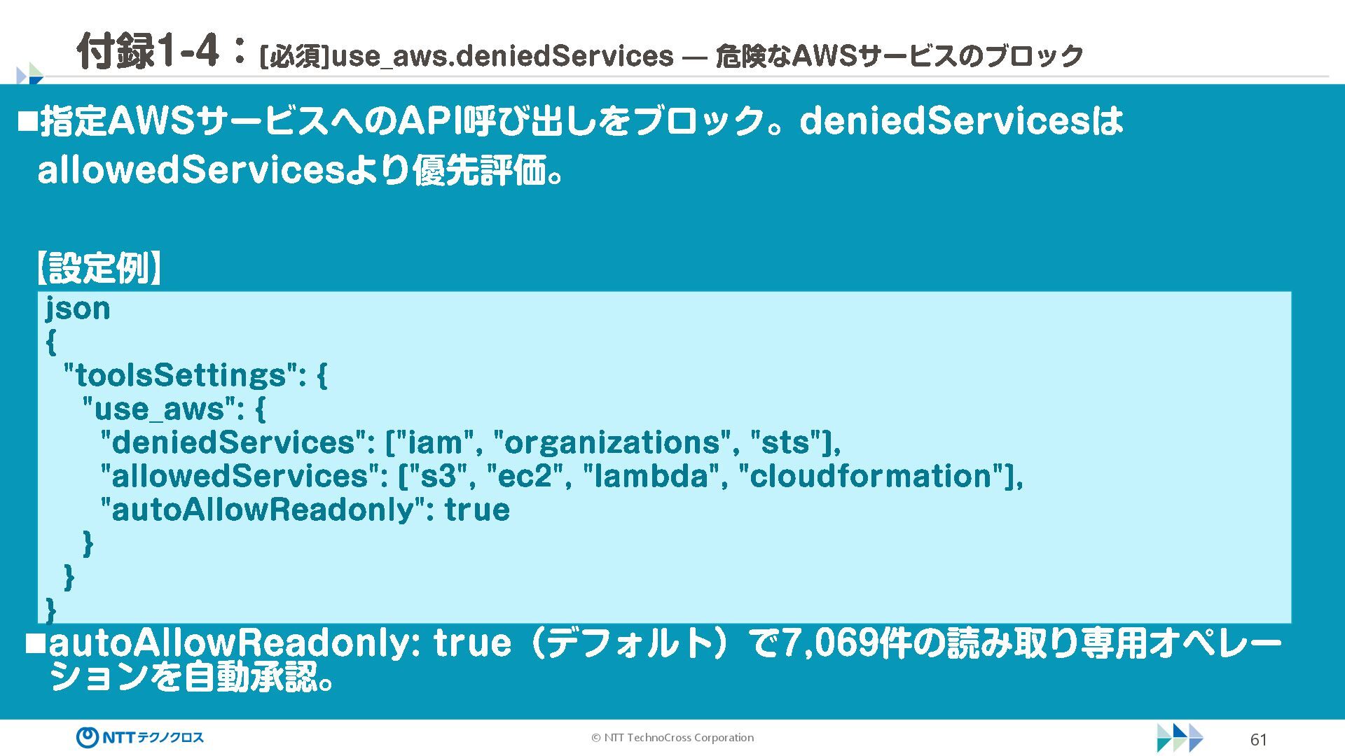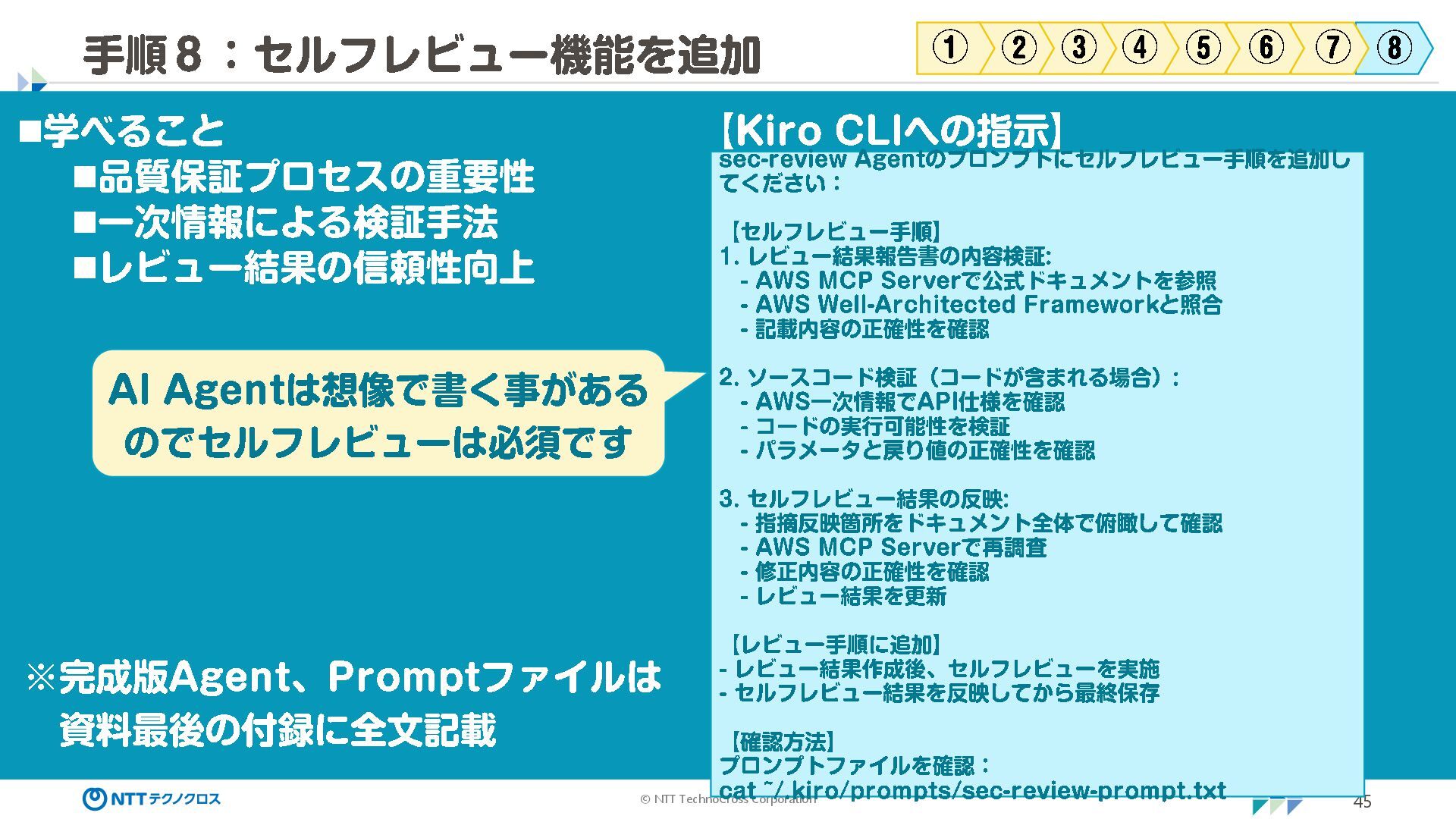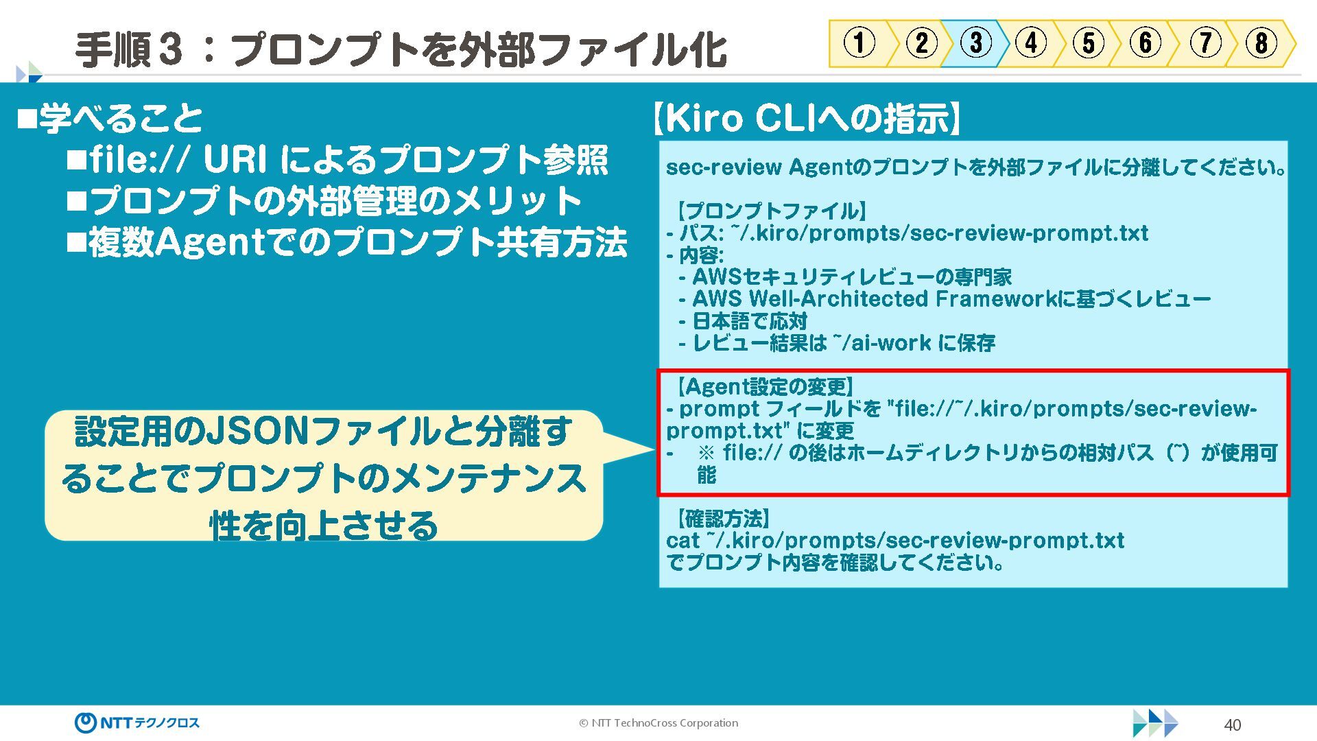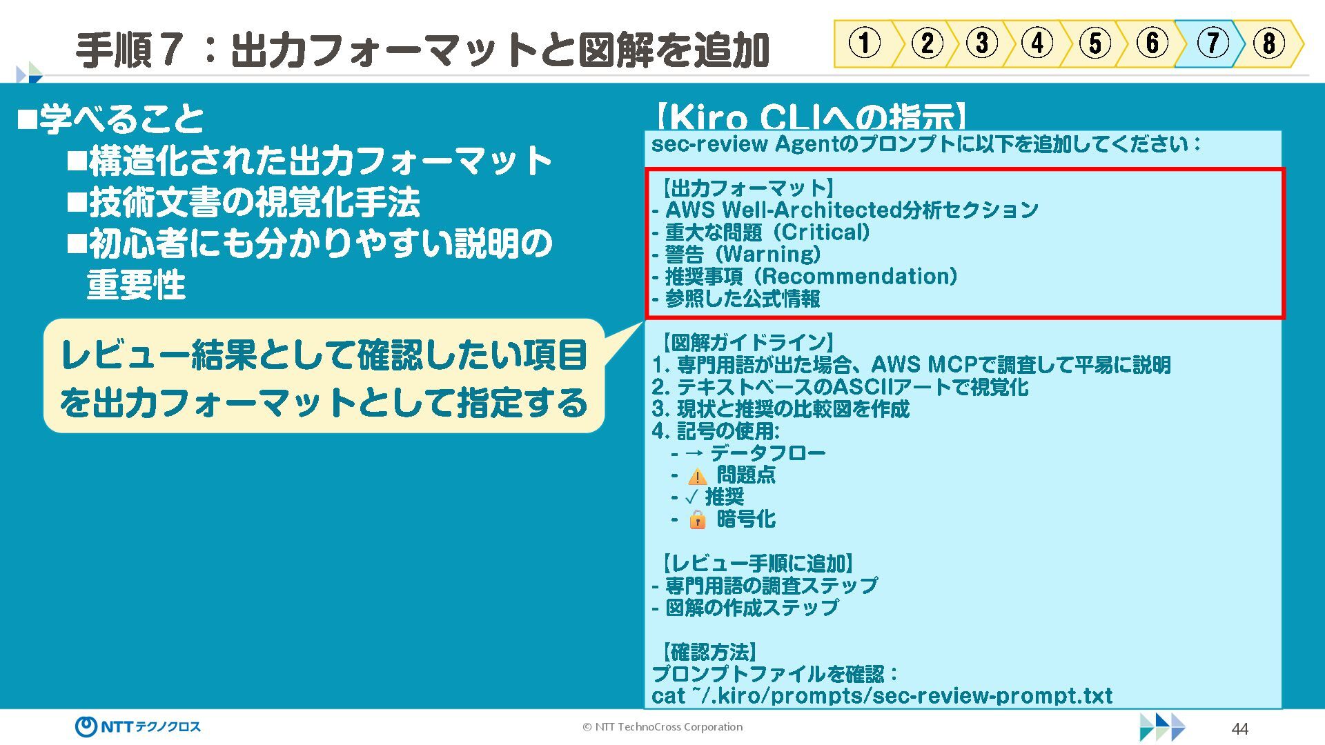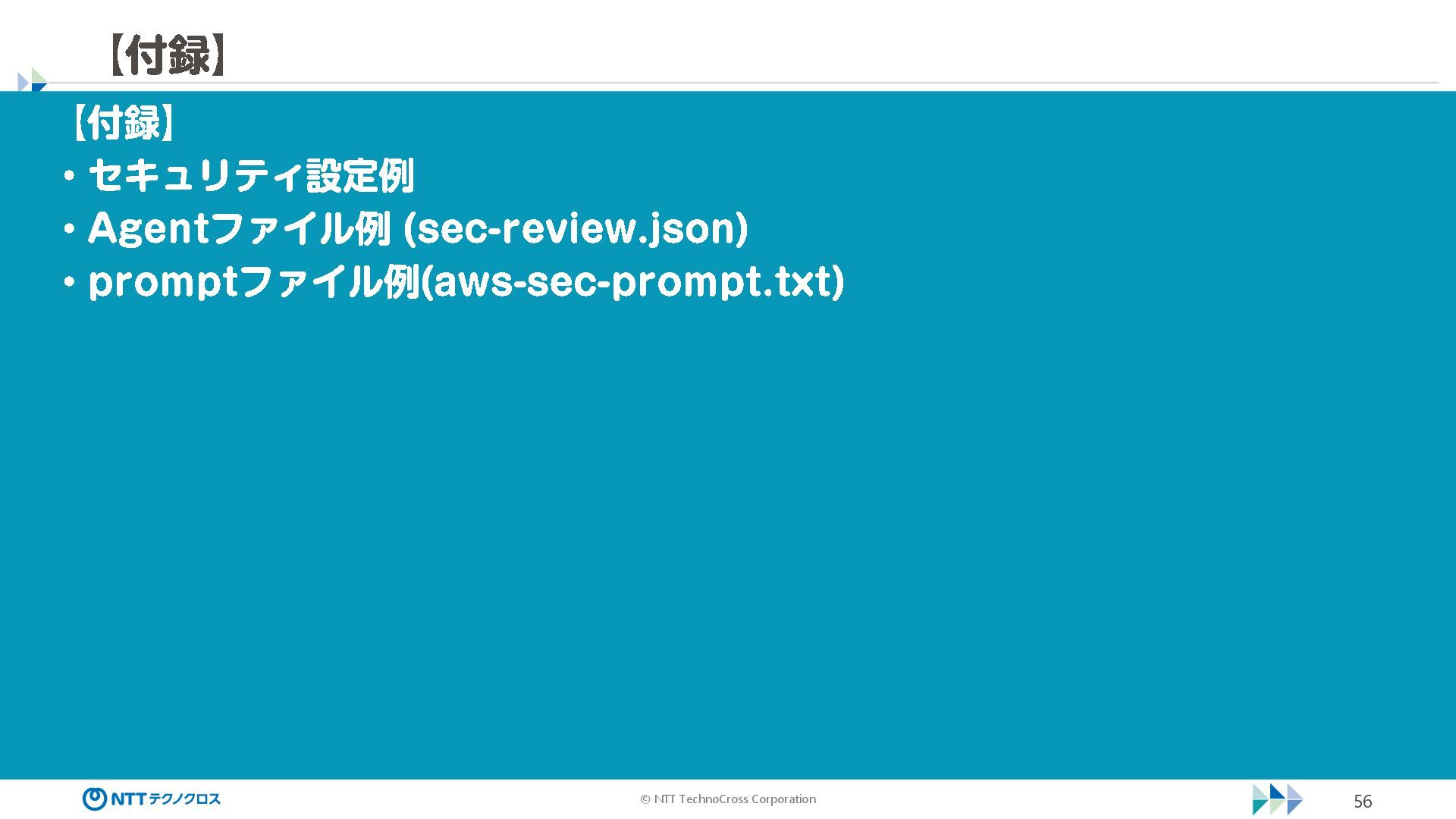 (sec -review.json) "glob": { "allowedPaths": [ "~/ai -work", "~/ai -plan" ], "allowReadOnly": true } }, "mcpServers": { "aws -mcp": { "command": "uvx", "timeout": 30000, "args": [ "mcp -proxy -for -aws@latest", "https://aws -mcp.us -east -1.api.aws/mcp", "-- metadata", "AWS_REGION=us -west -2" ] } }, "hooks": { "postToolUse": [ { "matcher": "@aws -mcp/*", "command": "echo ¥ "[$(TZ=Asia/Tokyo date '+%Y -%m - %d %H:%M:%S')] AWS MCP tool used: $TOOL_NAME ¥ " >> ~/ai - work/tool -usage.log", "description": "AWS MCP ツール使用履歴を記録 " } ] } } { "$schema": "https://raw.githubusercontent.com/aws/amazon -q - developer -cli/refs/heads/main/schemas/agent -v1.json", "name": "sec -review", "description": "AWS セキュリティレビュー専門家(学習用・最小構成) ", "prompt": "file://~/.kiro/prompts/sec -review -prompt.txt", "tools": [ "fs_read", "fs_write", "grep", "glob" ], "allowedTools": [ "fs_read", "grep", "glob" ], "toolsSettings": { "fs_write": { "allowedPaths": [ "~/ai -work/**", "~/ai -plan/**" ] }, "grep": { "allowedPaths": [ "~/ai -work", "~/ai -plan" ], "allowReadOnly": true },