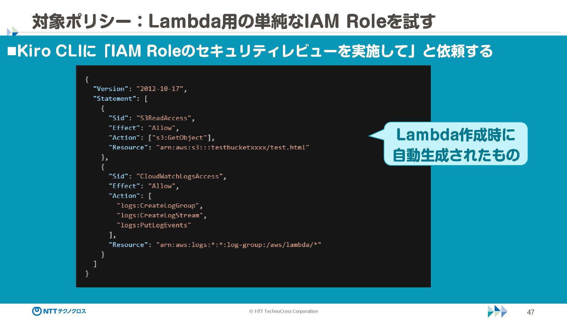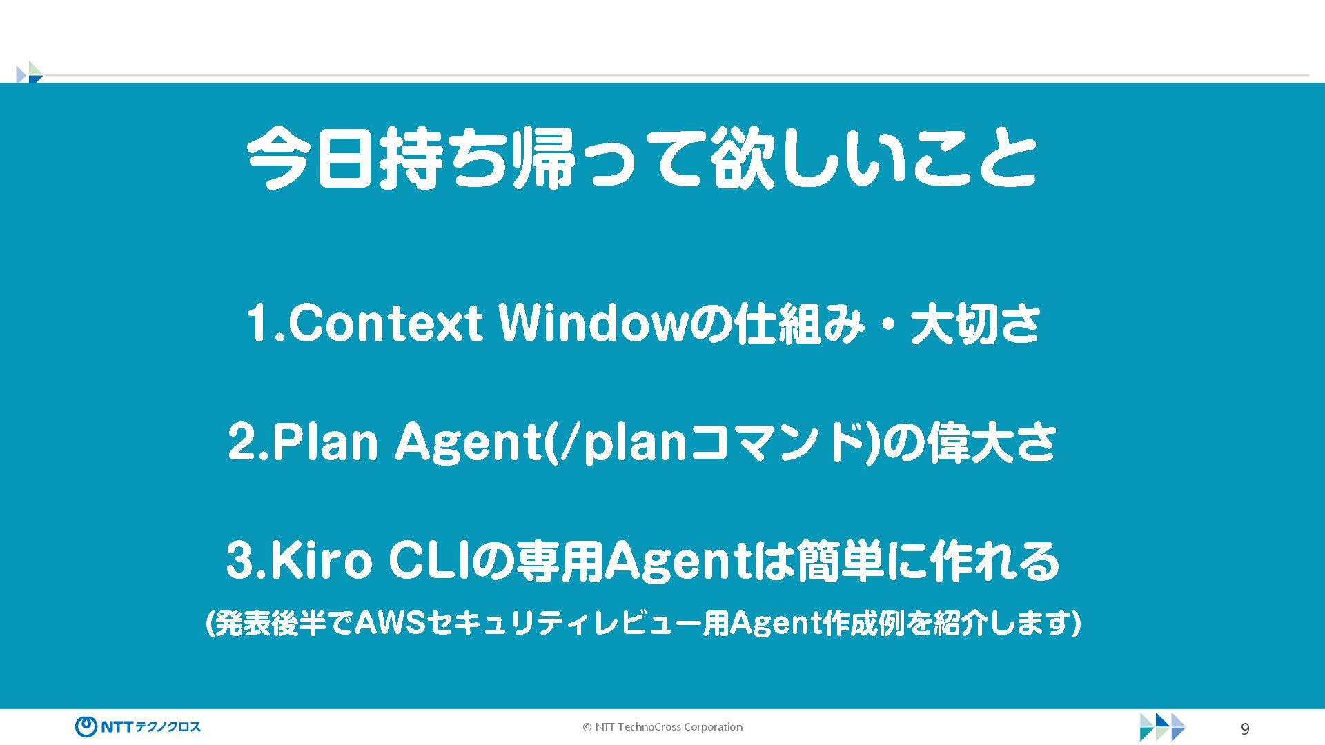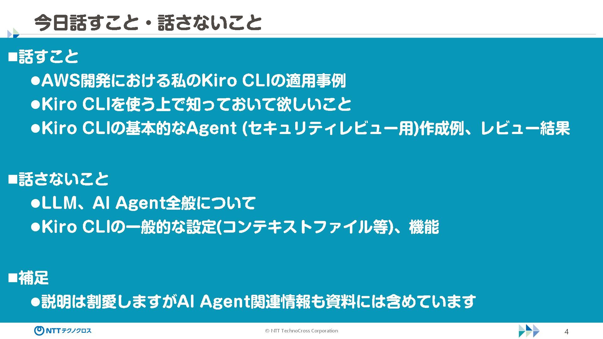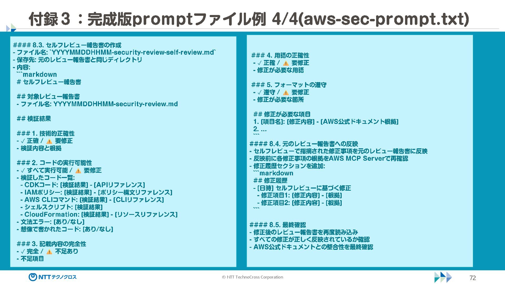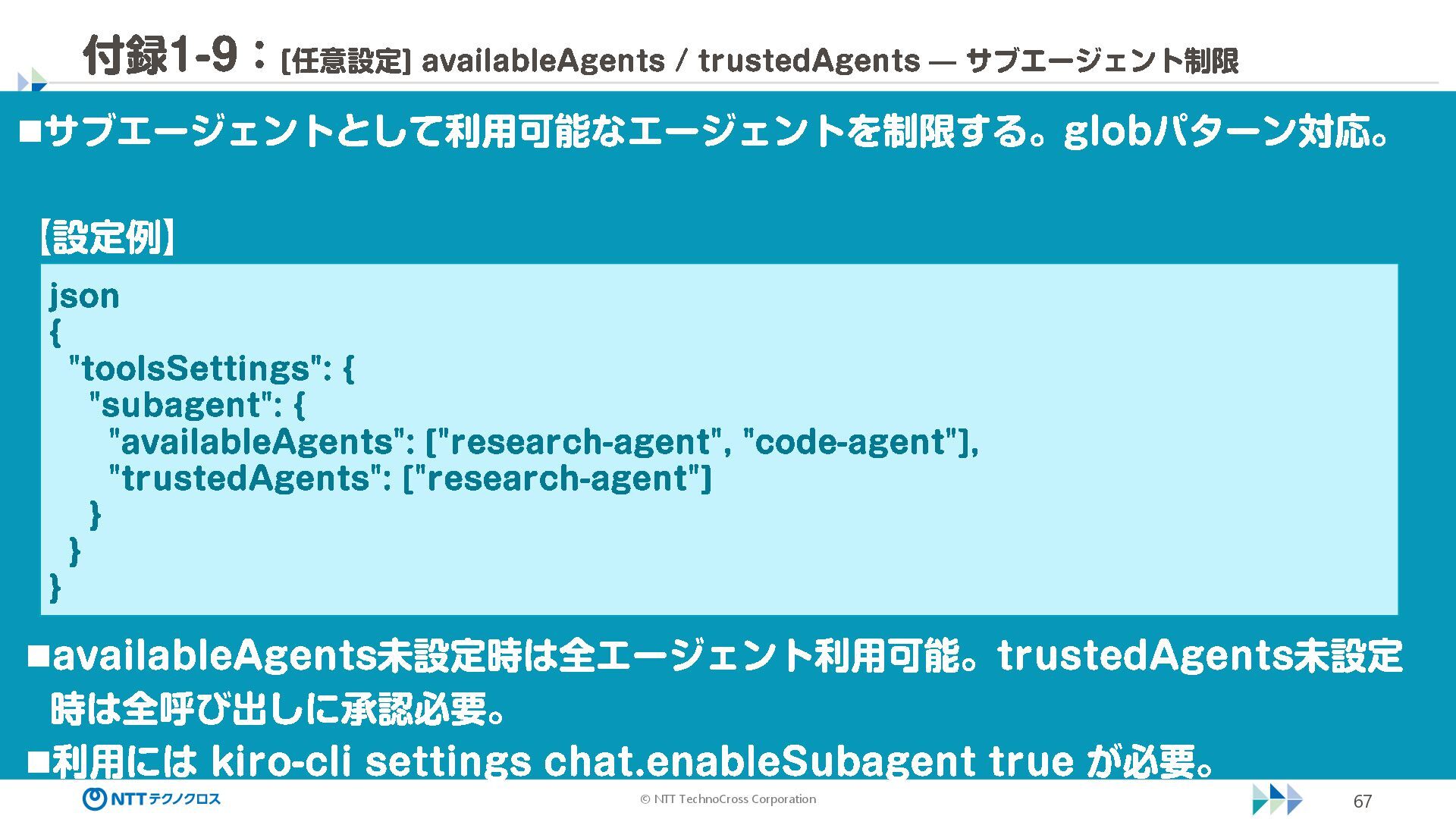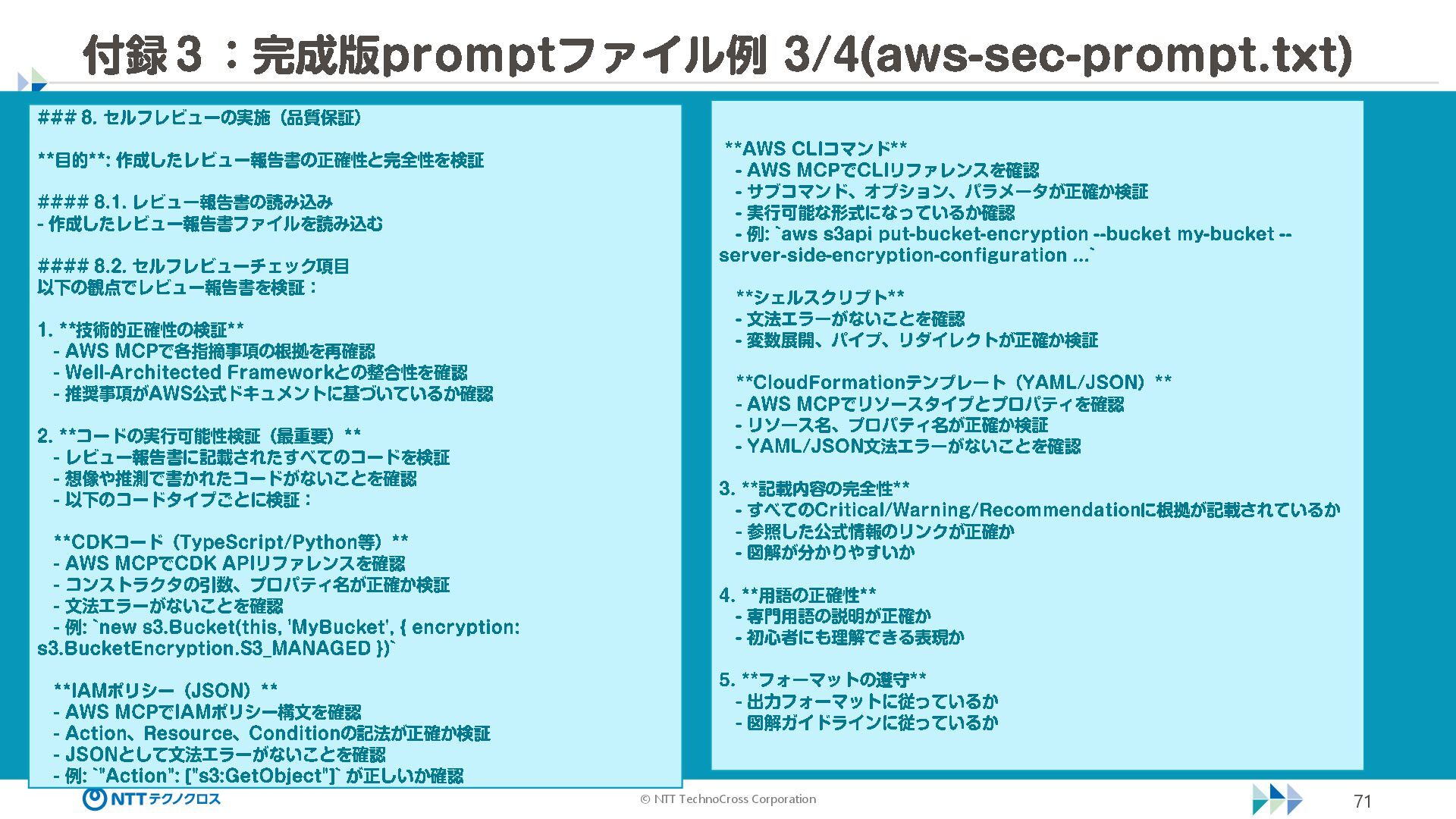 (sec -review.json) "glob": { "allowedPaths": [ "~/ai -work", "~/ai -plan" ], "allowReadOnly": true } }, "mcpServers": { "aws -mcp": { "command": "uvx", "timeout": 30000, "args": [ "mcp -proxy -for -aws@latest", "https://aws -mcp.us -east -1.api.aws/mcp", "-- metadata", "AWS_REGION=us -west -2" ] } }, "hooks": { "postToolUse": [ { "matcher": "@aws -mcp/*", "command": "echo ¥ "[$(TZ=Asia/Tokyo date '+%Y -%m - %d %H:%M:%S')] AWS MCP tool used: $TOOL_NAME ¥ " >> ~/ai - work/tool -usage.log", "description": "AWS MCP ツール使用履歴を記録 " } ] } } { "$schema": "https://raw.githubusercontent.com/aws/amazon -q - developer -cli/refs/heads/main/schemas/agent -v1.json", "name": "sec -review", "description": "AWS セキュリティレビュー専門家(学習用・最小構成) ", "prompt": "file://~/.kiro/prompts/sec -review -prompt.txt", "tools": [ "fs_read", "fs_write", "grep", "glob" ], "allowedTools": [ "fs_read", "grep", "glob" ], "toolsSettings": { "fs_write": { "allowedPaths": [ "~/ai -work/**", "~/ai -plan/**" ] }, "grep": { "allowedPaths": [ "~/ai -work", "~/ai -plan" ], "allowReadOnly": true },