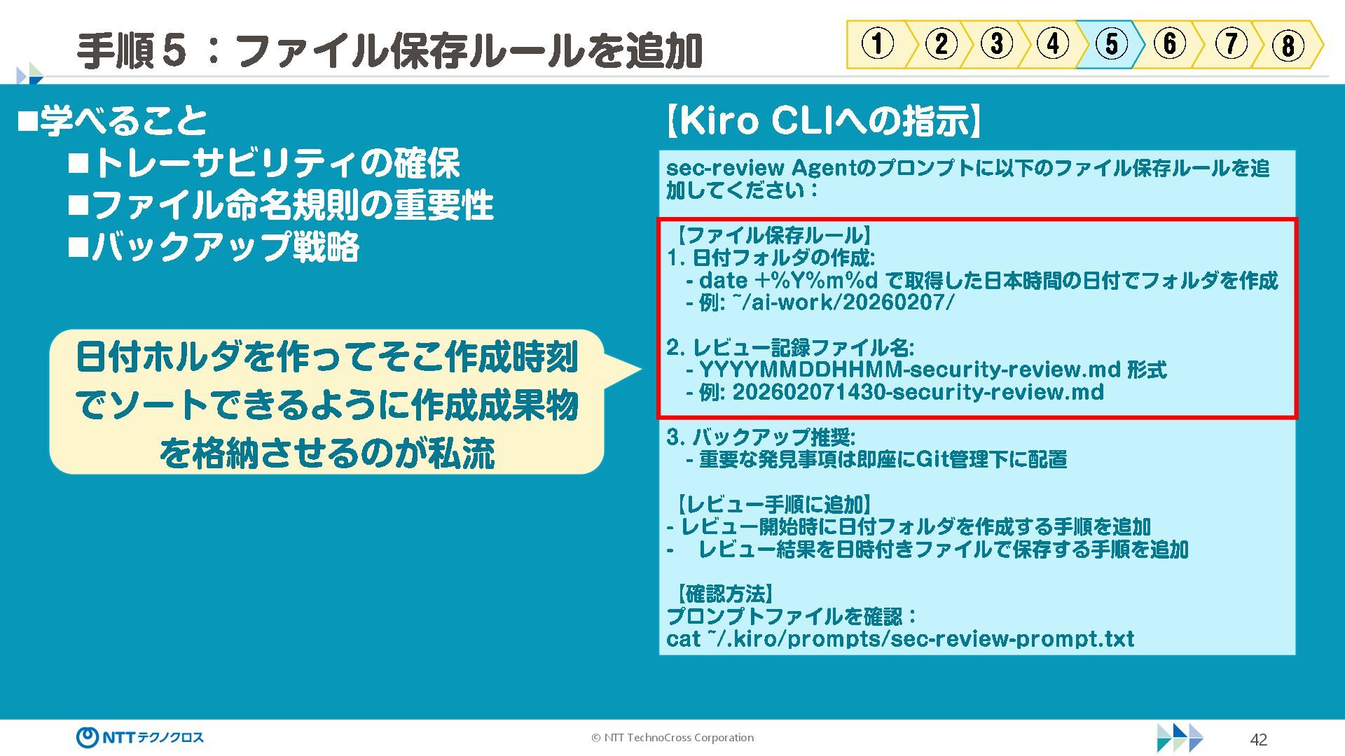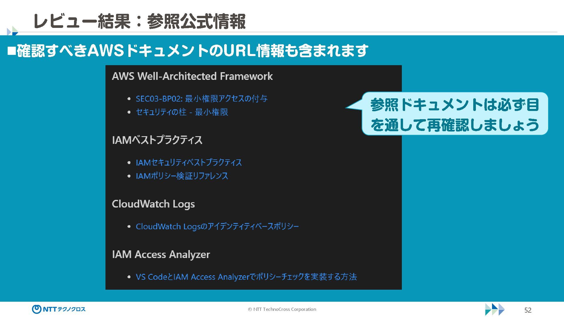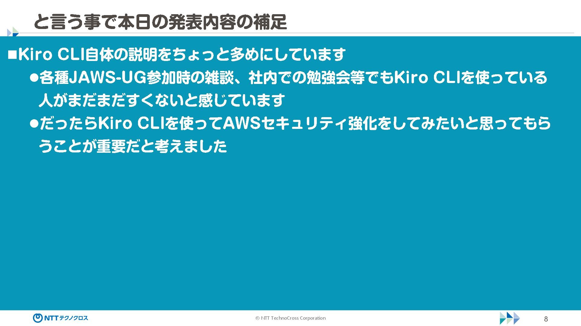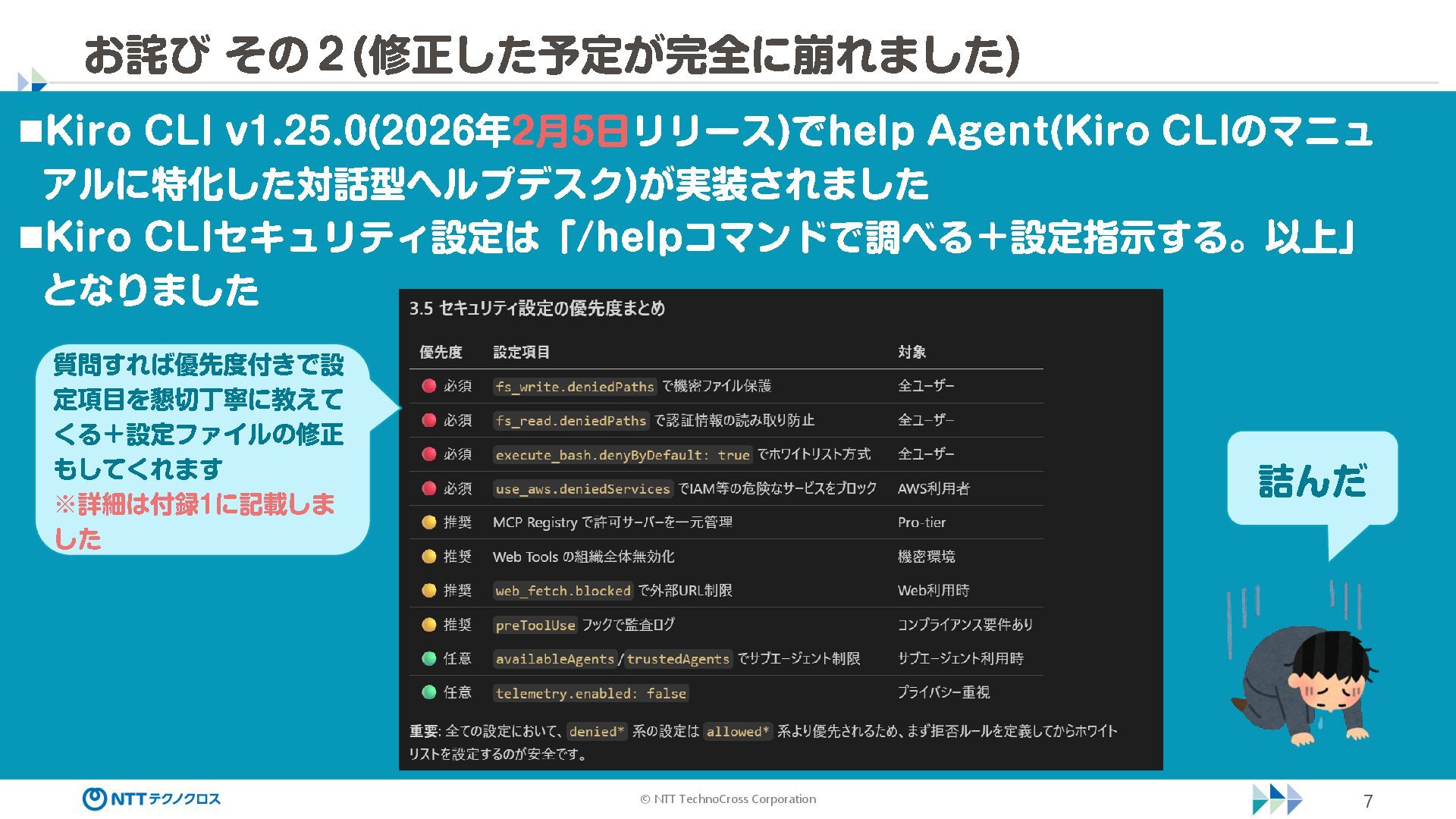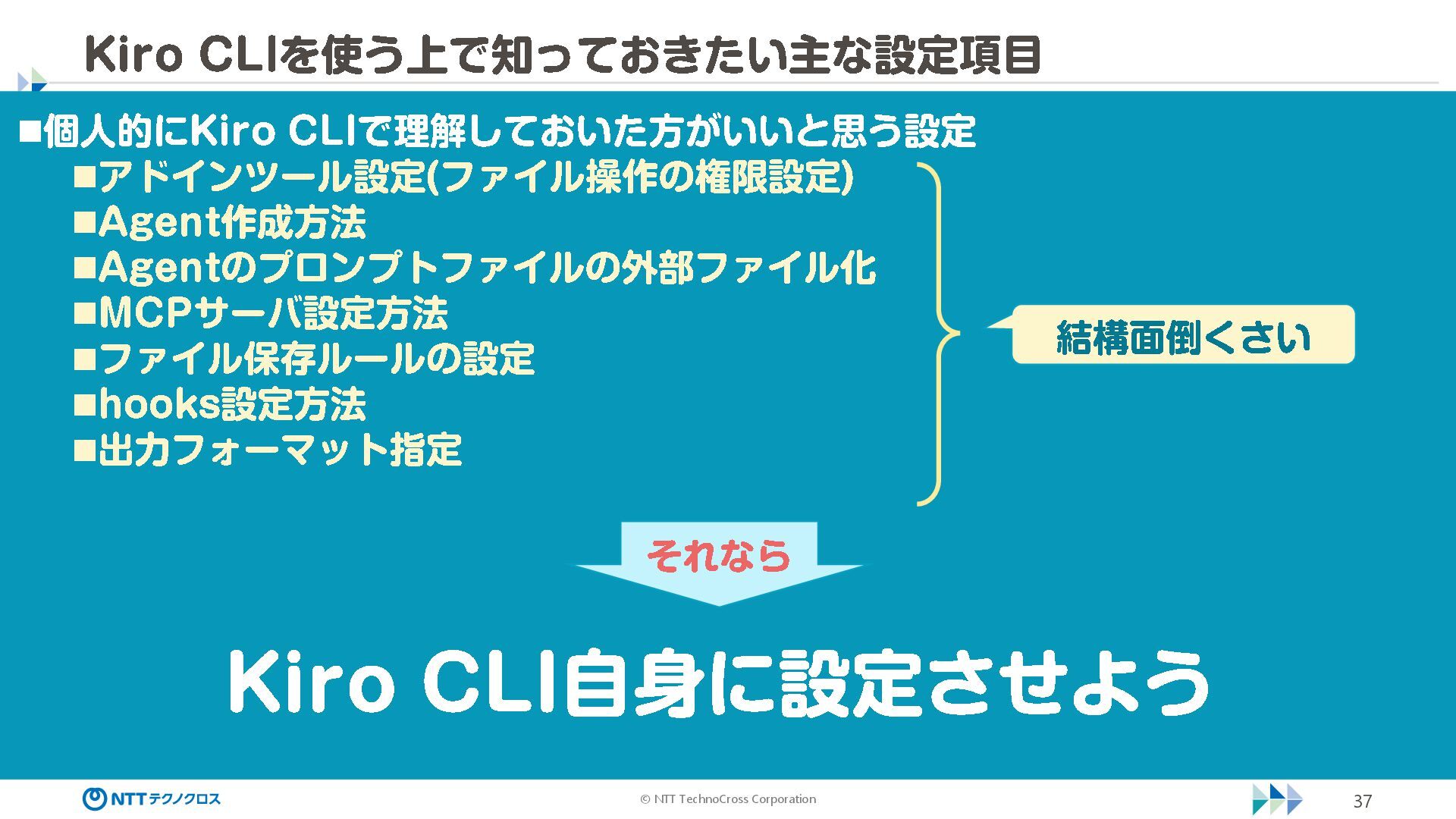 (sec -review.json) "glob": { "allowedPaths": [ "~/ai -work", "~/ai -plan" ], "allowReadOnly": true } }, "mcpServers": { "aws -mcp": { "command": "uvx", "timeout": 30000, "args": [ "mcp -proxy -for -aws@latest", "https://aws -mcp.us -east -1.api.aws/mcp", "-- metadata", "AWS_REGION=us -west -2" ] } }, "hooks": { "postToolUse": [ { "matcher": "@aws -mcp/*", "command": "echo ¥ "[$(TZ=Asia/Tokyo date '+%Y -%m - %d %H:%M:%S')] AWS MCP tool used: $TOOL_NAME ¥ " >> ~/ai - work/tool -usage.log", "description": "AWS MCP ツール使用履歴を記録 " } ] } } { "$schema": "https://raw.githubusercontent.com/aws/amazon -q - developer -cli/refs/heads/main/schemas/agent -v1.json", "name": "sec -review", "description": "AWS セキュリティレビュー専門家(学習用・最小構成) ", "prompt": "file://~/.kiro/prompts/sec -review -prompt.txt", "tools": [ "fs_read", "fs_write", "grep", "glob" ], "allowedTools": [ "fs_read", "grep", "glob" ], "toolsSettings": { "fs_write": { "allowedPaths": [ "~/ai -work/**", "~/ai -plan/**" ] }, "grep": { "allowedPaths": [ "~/ai -work", "~/ai -plan" ], "allowReadOnly": true },