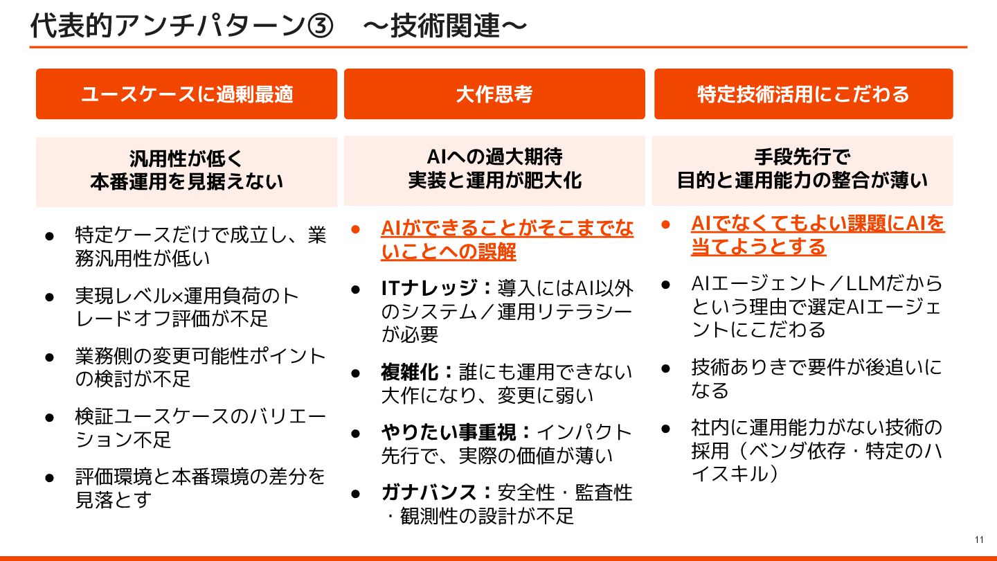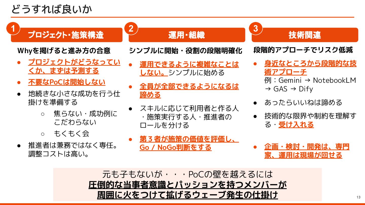 2025年11月13日(木)開催のラクスルさん主催「AI活用をPoCで終わらせない ─ 実用化に導くシステム・組織・オペレーション設計」イベントのLT登壇資料です。 19年くらいからの数多くのAIプロジェクトを実施した経験からPoCで終わらせないためのアンチパターンをまとめています イベントページ:https://raksul.connpass.com/event/373594/