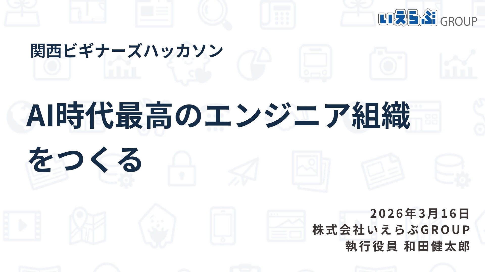 AI時代最高のエンジニア組織 をつくる 2026年3月16日 株式会社いえらぶGROUP 執行役員 和田健太郎 関西ビギナーズハッカソン