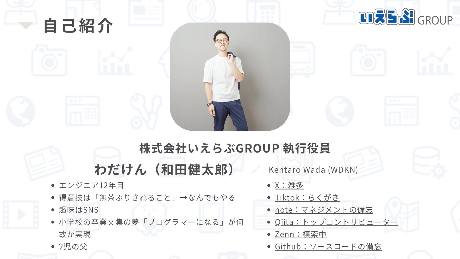 自己紹介 株式会社いえらぶGROUP 執行役員 エンジニア12年目 得意技は「無茶ぶりされること」→なんでもやる 趣味はSNS 小学校の卒業文集の夢「プログラマーになる」が何 故か実現 2児の父 / Kentaro