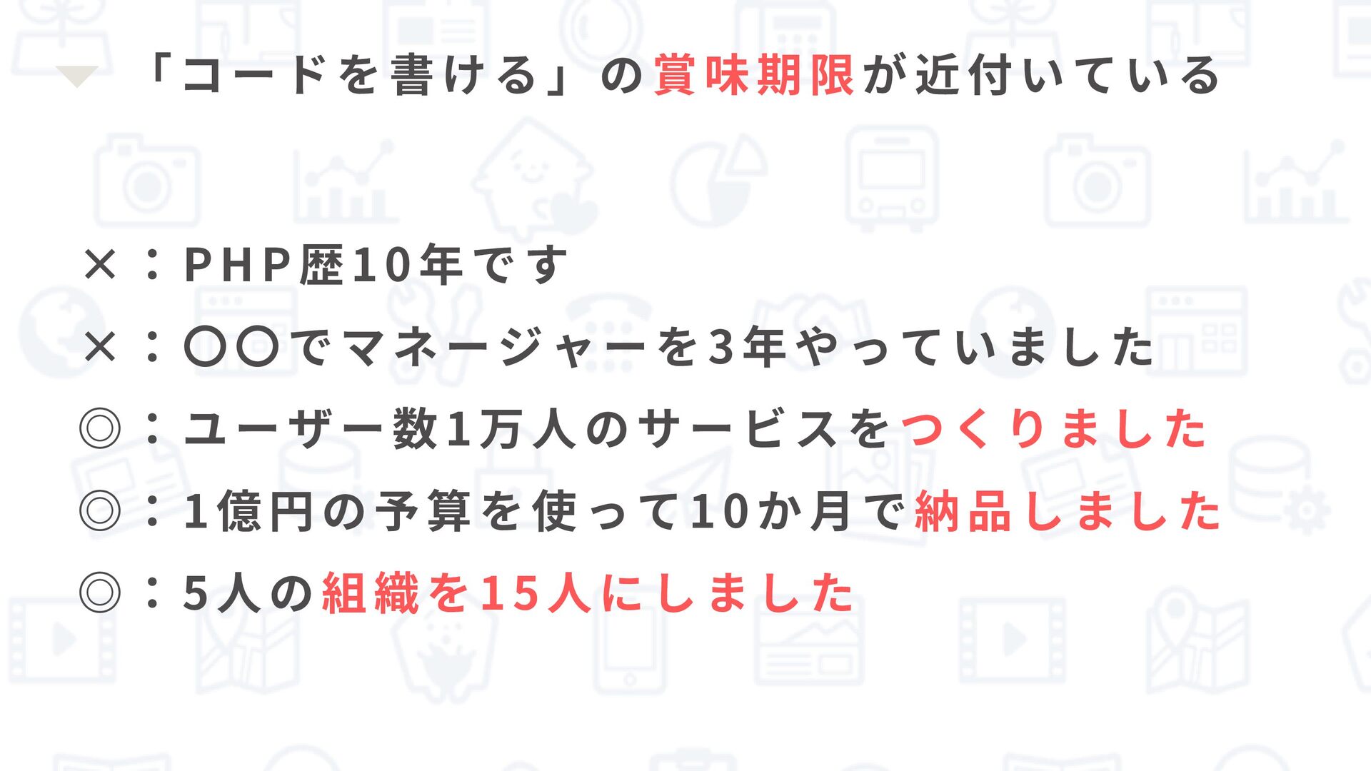 「コードを書ける」の 賞味期限 が近付い ている ×:PHP歴10年です ×:〇〇でマネージャーを3年やっていました ◎:ユーザー数1万人のサービスを つくりました ◎:1億円の予算を使って10か月で 納品しました
