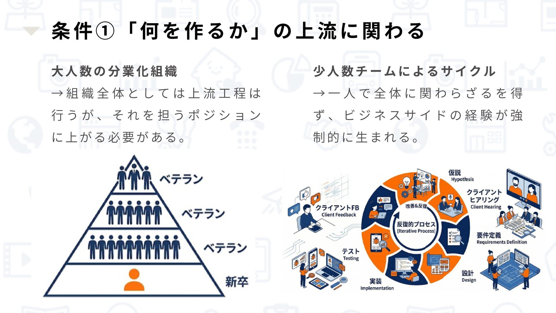 は 上 流 工 程 は 行 う が 、 そ れ を 担 う ポ ジ シ ョ ン に上がる必要がある。 少人数チームによるサイクル → 一 人 で 全 体 に 関 わ ら ざ る を 得 ず 、 ビ ジ ネ ス サ イ ド の 経 験 が 強 制的に生まれる。