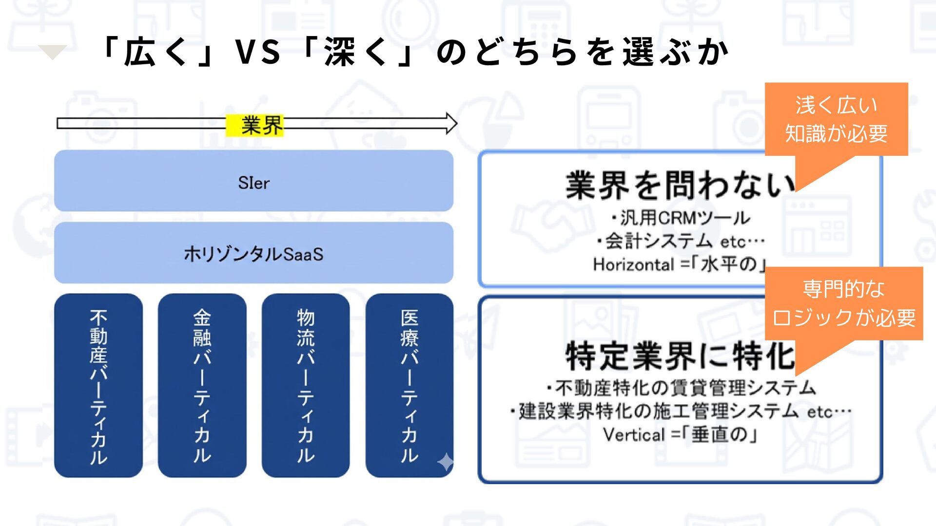 「広く」VS「深く」のどちらを選ぶか 浅く広い 知識が必要 専門的な ロジックが必要