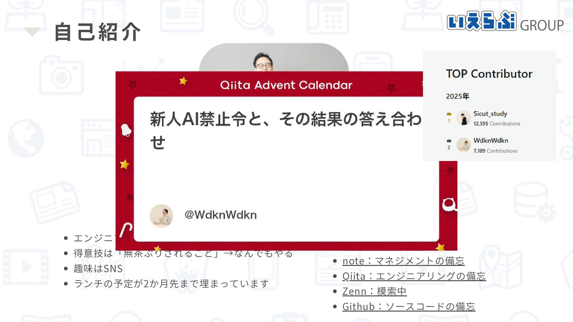 Wada (WDKN) わだけん(和田健太郎) X:雑多 Tiktok:らくがき note:マネジメントの備忘 Qiita:トップコントリビューター Zenn:模索中 Github:ソースコードの備忘