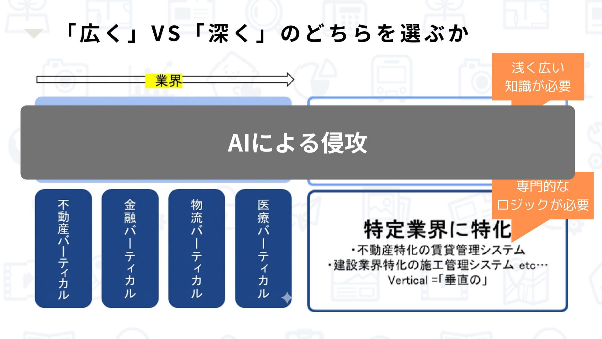 「広く」VS「深く」のどちらを選ぶか 浅く広い 知識が必要 専門的な ロジックが必要 AIによる侵攻