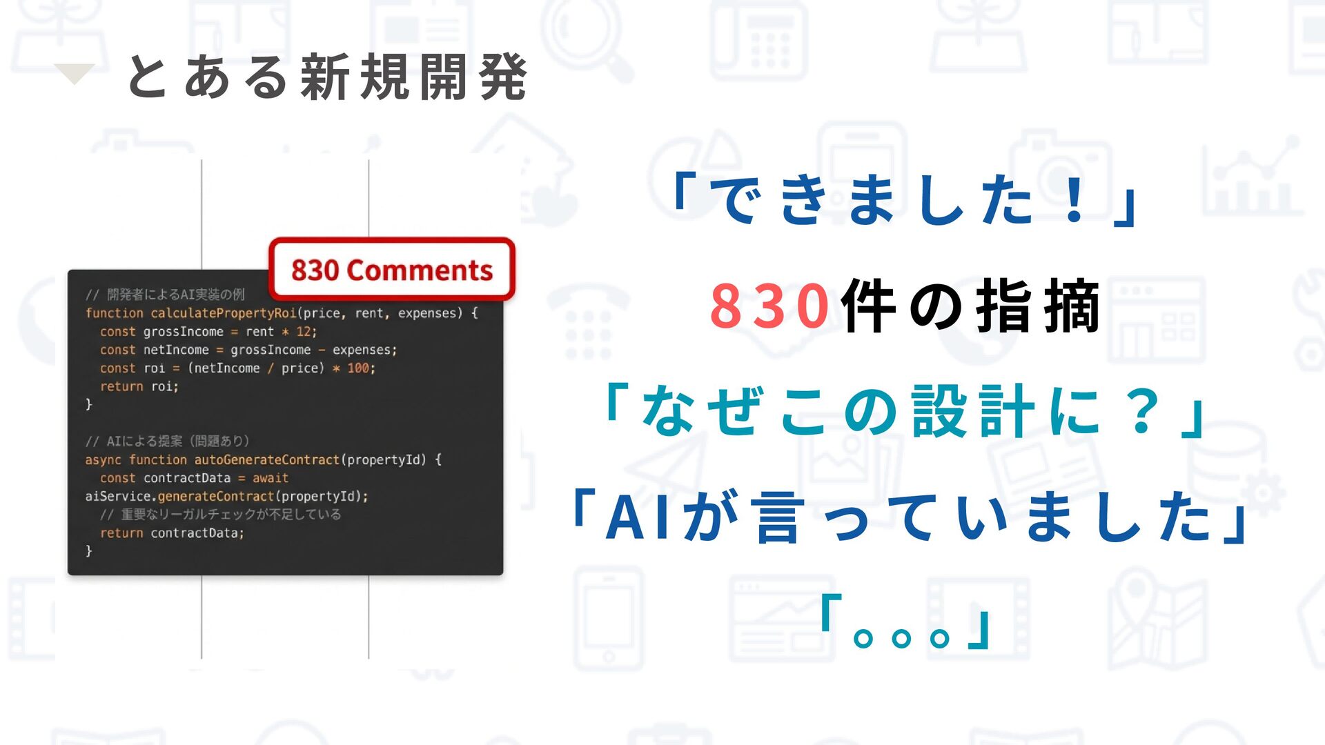 とある新規開発 「できました!」 830 件の指摘 「なぜこの設計に?」 「AIが言っていました」 「。 。 。 」
