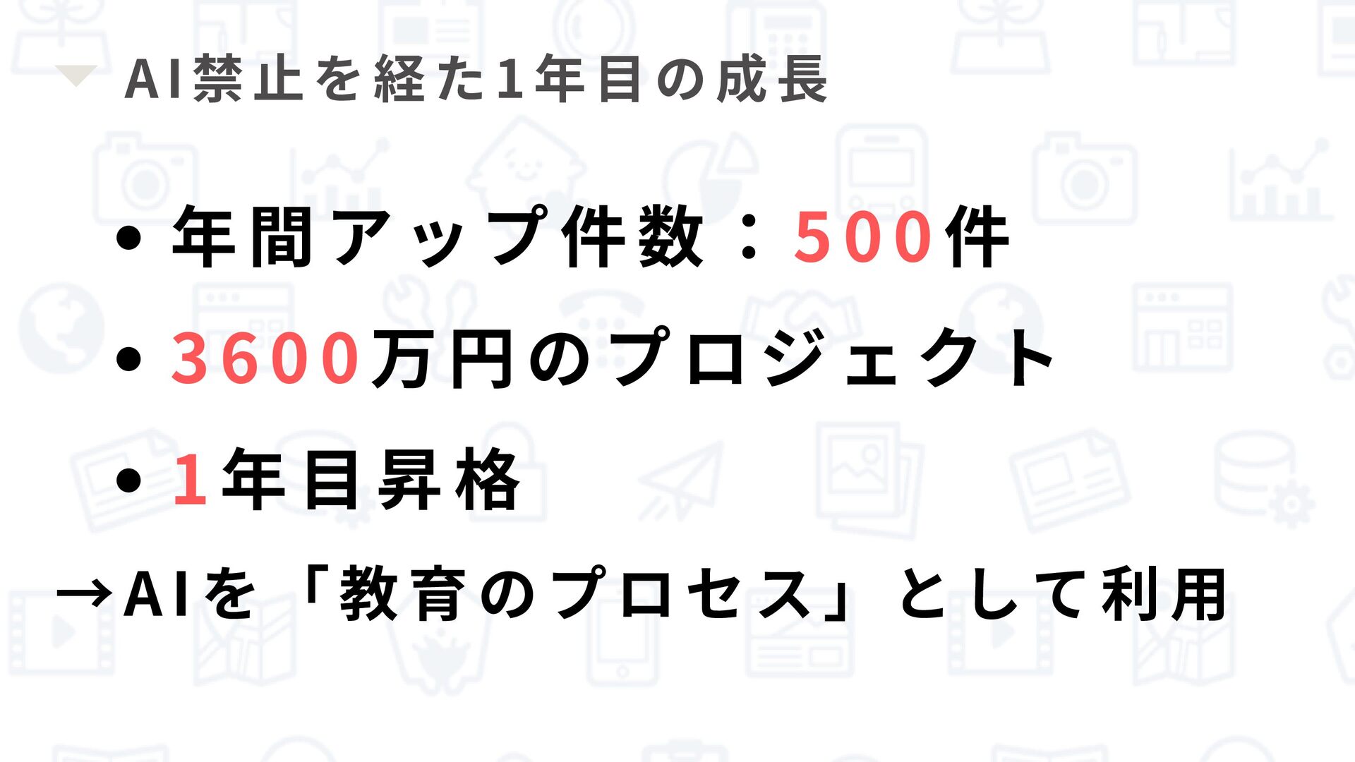 AI禁止を経た1年目の成長 年間アップ件数: 500 件 3600 万円のプロジェクト 1 年目昇格 →AIを「教育のプロセス」として利用