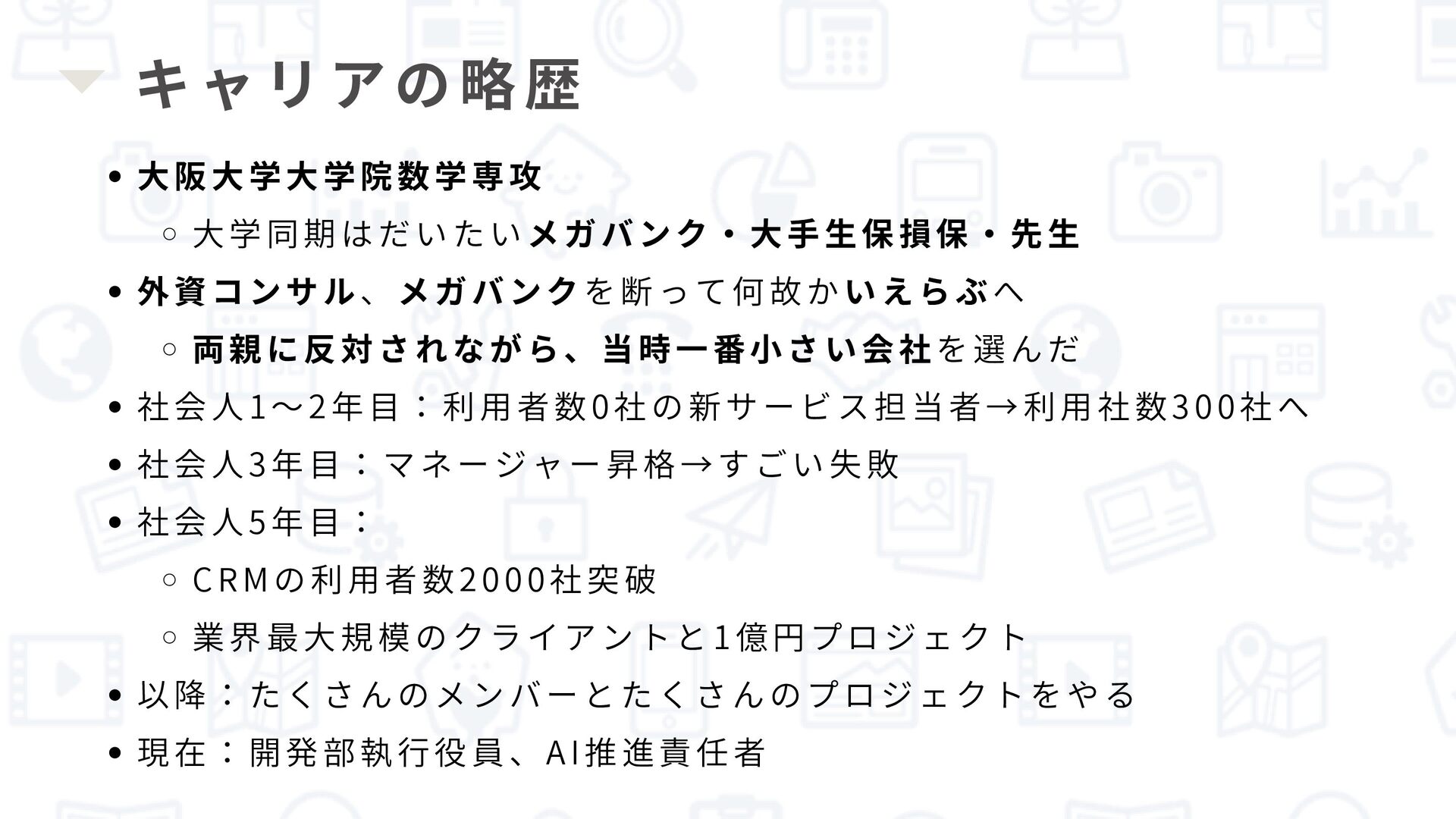 社会人1~2年目:利用者数0社の新サービス担当者→利用社数300社へ 社会人3年目:マネージャー昇格→すごい失敗 社会人5年目: CRMの利用者数2000社突破 業界最大規模のクライアントと1億円プロジェクト 以降:たくさんのメンバーとたくさんのプロジェクトをやる 現在:開発部執行役員、AI推進責任者