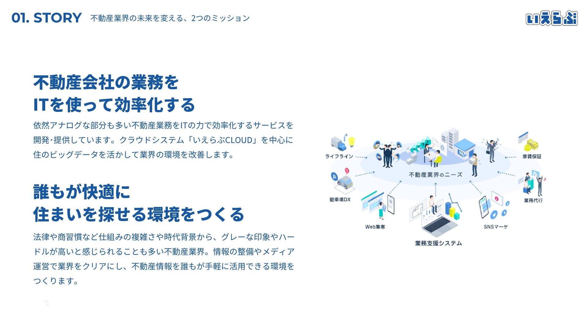 01. STORY 不動産業界の未来を変える、2つのミッション 依然アナログな部分も多い不動産業務をITの力で効率化するサービスを 開発・提供しています。クラウドシステム「いえらぶCLOUD」を中心に 住のビッグデータを活かして業界の環境を改善します。 法律や商習慣など仕組みの複雑さや時代背景から、グレーな印象やハー ドルが高いと感じられることも多い不動産業界。情報の整備やメディア 運営で業界をクリアにし、不動産情報を誰もが手軽に活用できる環境を つくります。