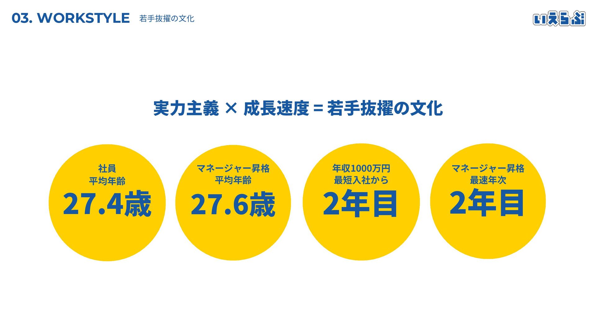 27.4歳 27.6歳 2年目 2年目 03. WORKSTYLE 若手抜擢の文化 社員 平均年齢 マネージャー昇格