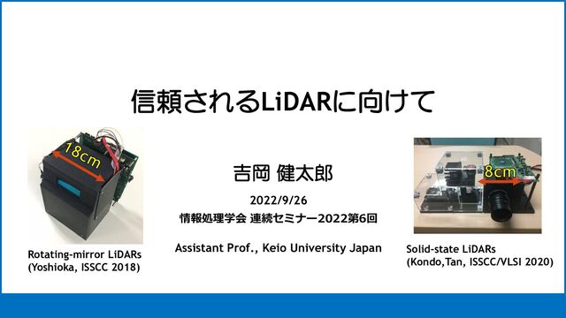 信頼されるAIを実現するにはAI自身の習熟度以外にもセンサの"信頼性"が求められる。本講演では自動運転やロボティクスで必需3DセンサであるLiDAR(Light Detection and Ranging)の信頼性を主に高解像度化とセキュリティの二面から問う。まず3D情報を活用したAIが十分な信ぴょう性を持つためにはLiDARの高解像度が不可避である。そのような高解像度LiDARの実現方法を回路システム的見地から議論し、先端LiDARの発展と照らし合わせる。そしてLiDARのハッキング可能性について議論し、セキュリティ方面の研究を紹介し、最後にハッキングの防衛方法を講じる。