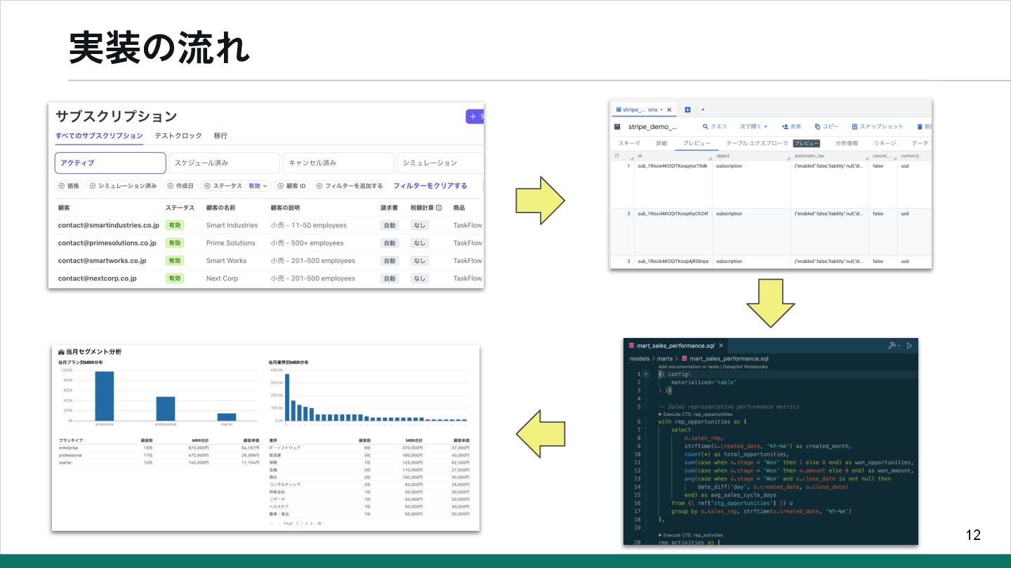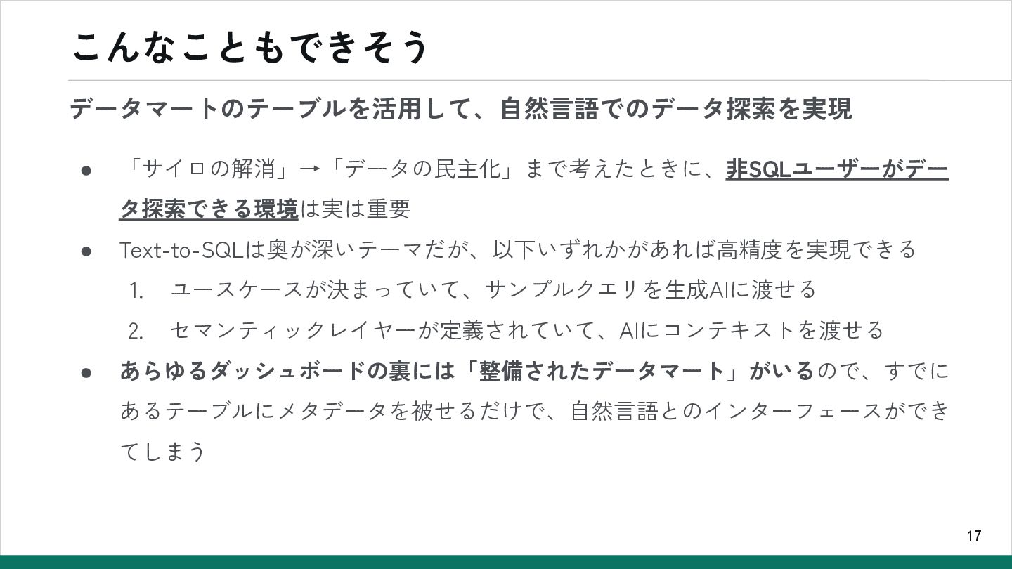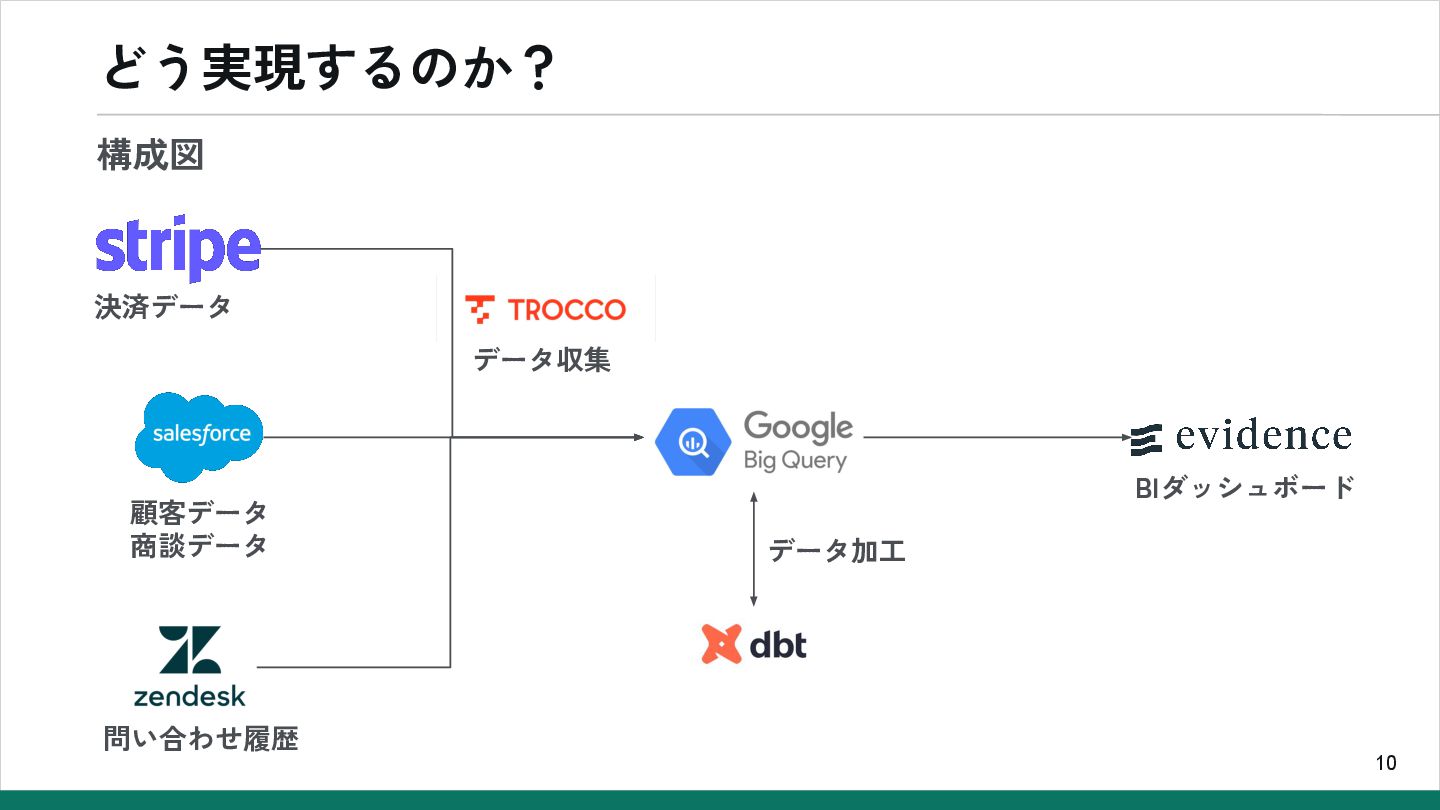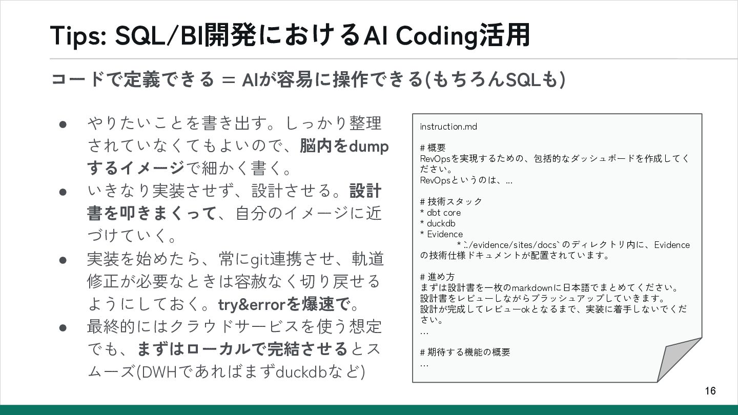 書を叩きまくって、自分のイメージに近 づけていく。 • 実装を始めたら、常にgit連携させ、軌道 修正が必要なときは容赦なく切り戻せる ようにしておく。try&errorを爆速で。 • 最終的にはクラウドサービスを使う想定 でも、まずはローカルで完結させるとス ムーズ(DWHであればまずduckdbなど) コードで定義できる = AIが容易に操作できる(もちろんSQLも) instruction.md # 概要 RevOpsを実現するための、包括的なダッシュボードを作成してく ださい。 RevOpsというのは、... # 技術スタック * dbt core * duckdb * Evidence * ` ../evidence/sites/docs` のディレクトリ内に、Evidence の技術仕様ドキュメントが配置されています。 # 進め方 まずは設計書を一枚のmarkdownに日本語でまとめてください。 設計書をレビューしながらブラッシュアップしていきます。 設計が完成してレビューokとなるまで、実装に着手しないでくだ さい。 … # 期待する機能の概要 …