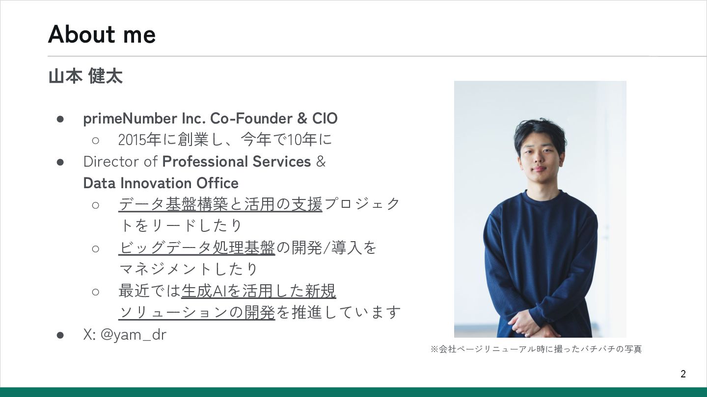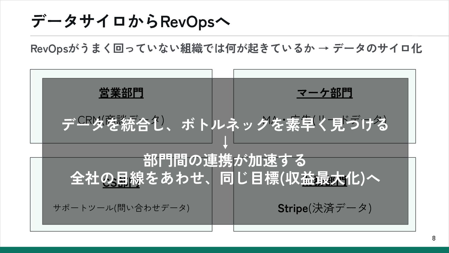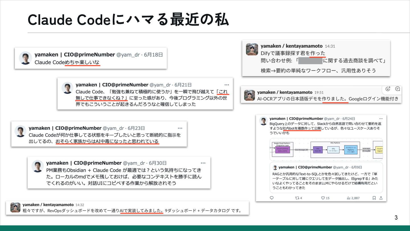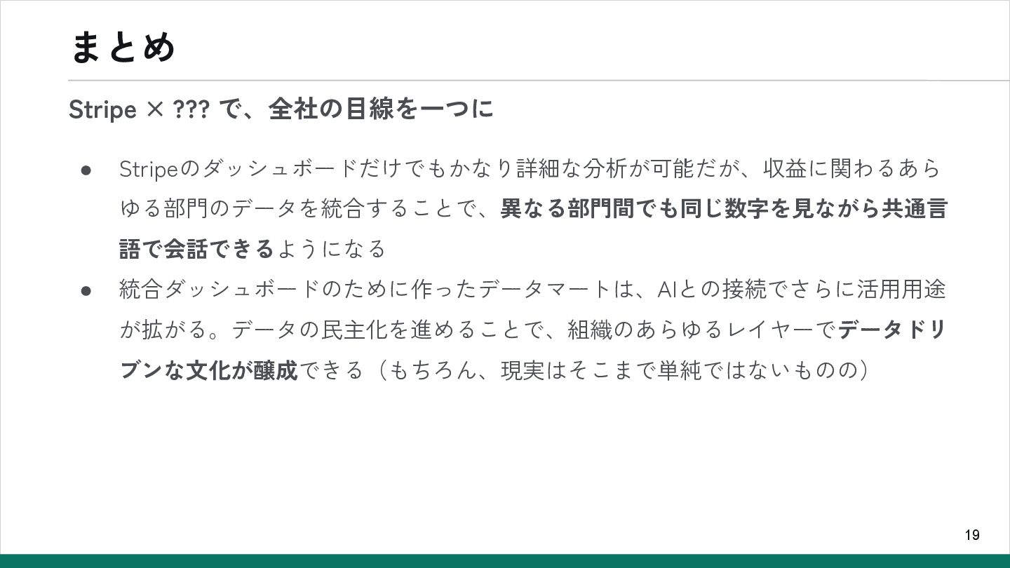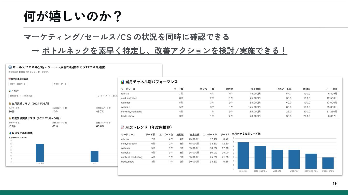 書を叩きまくって、自分のイメージに近 づけていく。 • 実装を始めたら、常にgit連携させ、軌道 修正が必要なときは容赦なく切り戻せる ようにしておく。try&errorを爆速で。 • 最終的にはクラウドサービスを使う想定 でも、まずはローカルで完結させるとス ムーズ(DWHであればまずduckdbなど) コードで定義できる = AIが容易に操作できる(もちろんSQLも) instruction.md # 概要 RevOpsを実現するための、包括的なダッシュボードを作成してく ださい。 RevOpsというのは、... # 技術スタック * dbt core * duckdb * Evidence * ` ../evidence/sites/docs` のディレクトリ内に、Evidence の技術仕様ドキュメントが配置されています。 # 進め方 まずは設計書を一枚のmarkdownに日本語でまとめてください。 設計書をレビューしながらブラッシュアップしていきます。 設計が完成してレビューokとなるまで、実装に着手しないでくだ さい。 … # 期待する機能の概要 …