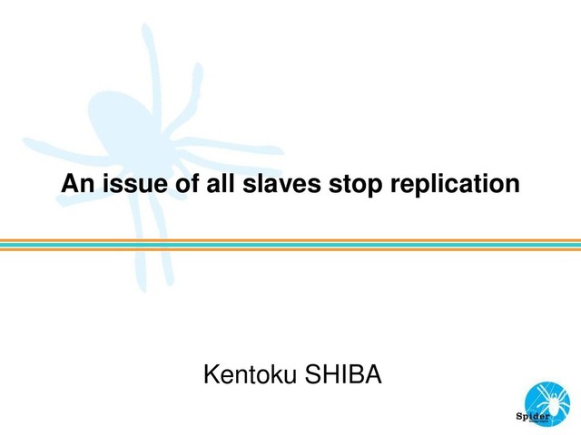 from master when reading data from binary log: 'unknown error reading log event on the master; the first event 'binlog.004215' at 8610479, the last event read from './binlog.004226' at 154, the last byte read from './binlog.004226' at 154.‘”. We can see this error by “show slave status”. - When you execute “START SLAVE”, position slightly advances and replication stops with the same error again. - Recovery by executing “START SLAVE” on the slaves after binary log rotation on the master. - No HW error, Not disk full. Abstract of the issue