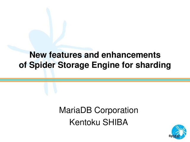 solution and proxying solution. Spider Storage Engine is a plugin of MariaDB/MySQL. Spider tables can be used to federate from other servers MariaDB/MySQL/OracleDB tables as if they stand on local server. And Spider can create database sharding by using table partitioning feature.