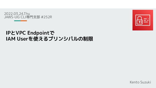 to AWS based on the source IP https://docs.aws.amazon.com/IAM/latest/UserGuide/reference_policies_examples_aws_deny -ip.html Creating a condition with multiple keys or values https://docs.aws.amazon.com/IAM/latest/UserGuide/reference_policies_multi-value-conditio ns.html 本スライドのQiita版 https://qiita.com/suzuki_kento/items/5e87ed8bd71f05281382