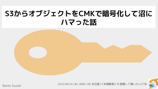 S3からオブジェクトをCMKで暗号化して沼に ハマった話 Kento Suzuki 2022/08/24 (水) JAWS-UG 名古屋 LT未経験者にも登壇して貰いたいLT会