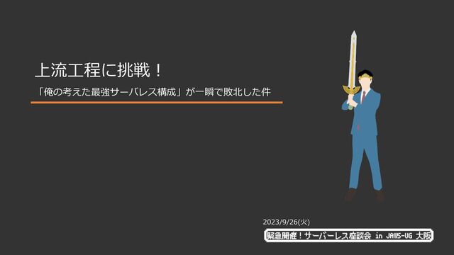 上流⼯程に挑戦︕ 「俺の考えた最強サーバレス構成」が⼀瞬で敗北した件 2023/9/26(⽕)