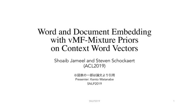 easy to see that this objective is equivalent to maximizing the following likelihood function P(D|⌦) / Y i,j xij6=0 N(log xij; µij, 2)f(xij) where 2 > 0 can be chosen arbitrarily, N means the Normal distribution and µij = wi · ˜ wj + bi + ˜ bj Furthermore, D denotes the given corpus and ⌦ refers to the set of parameters learned by the word embedding model, i.e. the word vectors wi and ˜ wj and the bias terms. The advantage of this probabilistic formulation is that it allows us to introduce priors on the pa- rameters of the model. This strategy was recently for ✓ 6= 0, while k✓k ter. To est samples, w and Gr¨ un, A finite movMF, i of the foll where K k 0 (✓1, ..., ✓K tribution c Maximiza where xij is the number of times wi and wj co- occur in the given corpus, bi and ˜ bj are bias terms and f(xij) is a weighting function aimed at reduc- ing the impact of sparse co-occurrence counts. It is easy to see that this objective is equivalent to maximizing the following likelihood function P(D|⌦) / Y i,j xij6=0 N(log xij; µij, 2)f(xij) where 2 > 0 can be chosen arbitrarily, N means the Normal distribution and µij = wi · ˜ wj + bi + ˜ bj Furthermore, D denotes the given corpus and ⌦ refers to the set of parameters learned by the word embedding model, i.e. the word vectors wi and ˜ wj which is com geometric fu not need to e acts as a scal for ✓ 6= 0, is while k✓k is ter. To estim samples, we and Gr¨ un, 20 A finite m movMF, is a of the follow h where K is k 0 fo ฏۉʢੵʣͱࢄ͔ΒڞىසΛੜ͢Δº ࠞ߹W.'Ϟσϧʹج͍ͮͯจ຺୯ޠΛੜ͢ΔࣄલΛ࠷େԽ͢Δ Y i,j xij6=0 N(log xij; µij, 2)f(xij) · Y i P( ˜ wi) Essentially, we want the prior P( ˜ wi) to model the assumption that context word vectors are clus- tered. To this end, we use a mixture of von-Mises Fisher distributions. To describe this distribution, we begin with a von Mises-Fisher (vMF) distri- bution (Mardia and Jupp, 2009; Hornik and Gr¨ un, 2014), which is a distribution over unit vectors in Rd that depends on a parameter ✓ 2 Rd, where d will denote the dimensionality of the word vec- tors. The vMF density for x 2 Sd (with Sd the d-dimensional unit hypersphere) is given by: vmf(x|✓) = e✓| x 0F1(; d/2; ||✓||2 4 ) where the denominator is given by 0F1(; p; q) = 1 X n=0 (p) (p + n) qn n! Furthermore, we use L2 regularization to constrain the norm k˜ wk. We will refer to our model as CvMF. In the experiments, following (Jameel et al., 2019), we will also consider a variant of our model in which we use a context-word specific variance 2 j . In that case, we maximize the following: Y i,j xij6=0 N(log xij; µij, 2 j ) · Y i P( ˜ wi) · Y i P( 2 j ) where P( 2 j ) is modelled as an inverse-gamma distribution (NIG). Note that in this variant we do not use the weighting function f(xij), as this was found to be unnecessary when using a context- word specific variance 2 j in (Jameel et al., 2019). We will refer this variant as CvMF(NIG). Document embedding. The model described above can also be used to learn document embed- dings. To this end, the target word vectors are sim- ply replaced by document vectors and the counts The advantage of this probabilistic formulation is that it allows us to introduce priors on the pa- rameters of the model. This strategy was recently used in the WeMAP model (Jameel et al., 2019) to replace the constant variance 2 by a variance 2 j that depends on the context word. In this paper, however, we will use priors on the parameters of the word embedding model itself. Specifically, we will impose a prior on the context word vectors ˜ w, i.e. we will maximize: Y i,j xij6=0 N(log xij; µij, 2)f(xij) · Y i P( ˜ wi) Essentially, we want the prior P( ˜ wi) to model the assumption that context word vectors are clus- tered. To this end, we use a mixture of von-Mises Fisher distributions. To describe this distribution, we begin with a von Mises-Fisher (vMF) distri- bution (Mardia and Jupp, 2009; Hornik and Gr¨ un, 2014), which is a distribution over unit vectors in Rd that depends on a parameter ✓ 2 Rd, where d will denote the dimensionality of the word vec- 1 K tribution can be computed using the Expectation- Maximization (EM) algorithm (Banerjee et al., 2005; Hornik and Gr¨ un, 2014). Note that movMF is a distribution on unit vec- tors, whereas context word vectors should not be normalized. We therefore define the prior on con- text word vectors as follows: P(˜ w) / h ˜ w k˜ wk | ⇥ Furthermore, we use L2 regularization to constrain the norm k˜ wk. We will refer to our model as CvMF. In the experiments, following (Jameel et al., 2019), we will also consider a variant of our model in which we use a context-word specific variance 2 j . In that case, we maximize the following: Y i,j xij6=0 N(log xij; µij, 2 j ) · Y i P( ˜ wi) · Y i P( 2 j ) where P( 2) is modelled as an inverse-gamma Y i,j xij6=0 N(log xij; µij, 2)f(xij) · Y i P( ˜ wi) Essentially, we want the prior P( ˜ wi) to model the assumption that context word vectors are clus- tered. To this end, we use a mixture of von-Mises Fisher distributions. To describe this distribution, we begin with a von Mises-Fisher (vMF) distri- bution (Mardia and Jupp, 2009; Hornik and Gr¨ un, 2014), which is a distribution over unit vectors in Rd that depends on a parameter ✓ 2 Rd, where d will denote the dimensionality of the word vec- tors. The vMF density for x 2 Sd (with Sd the d-dimensional unit hypersphere) is given by: vmf(x|✓) = e✓| x 0F1(; d/2; ||✓||2 4 ) where the denominator is given by 0F1(; p; q) = 1 X n=0 (p) (p + n) qn n! Furthermore, we use L2 regularization to constrain the norm k˜ wk. We will refer to our model as CvMF. In the experiments, following (Jameel et al., 2019), we will also consider a variant of our model in which we use a context-word specific variance 2 j . In that case, we maximize the following: Y i,j xij6=0 N(log xij; µij, 2 j ) · Y i P( ˜ wi) · Y i P( 2 j ) where P(