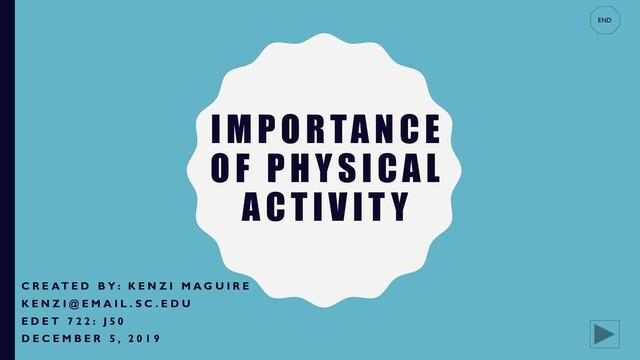 Objective 1.1: Given the term physical activity, learners will be able to identify the correct definition. • Goal 2: – Objective 2.1: Given the importance of physical activity, learners will be able to define and identify the important aspects of physical activity. • Goal 3: Identify activities that are considered physical activities. – Objective 3.1: Given the definition of physical activity, learners will be able to identify activities that are and are not considered physical activities. • Goal 4: Understand the role of creating a consistent physically active lifestyle. – Objective 4.1: Given examples of physical activities, learners will be able to incorporate those activities into their everyday lifestyle. END