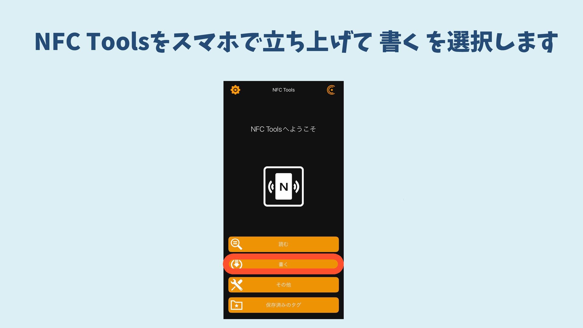 NFC Toolsをスマホで立ち上げて 書く を選択します