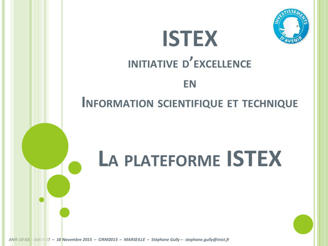 Stéphane Gully – [email protected] Les chargements des données dans la plateforme Usage 1 : Outils de découvertes Usage 2 : Portails doc, CMS, ENT Enrichissements des données ISTEX Usage 3 : Extraction de corpus pour la recherche Le tout parsemé de démos DÉROULEMENT DE LA PRÉSENTATION