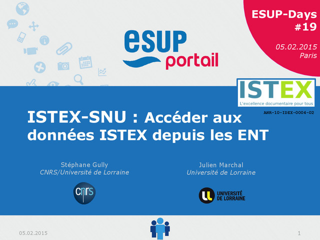 ISTEX-SNU : Accéder aux données ISTEX depuis les ENT Stéphane Gully CNRS/Université de Lorraine ANR-10-IDEX-0004-02 Julien Marchal Université de Lorraine