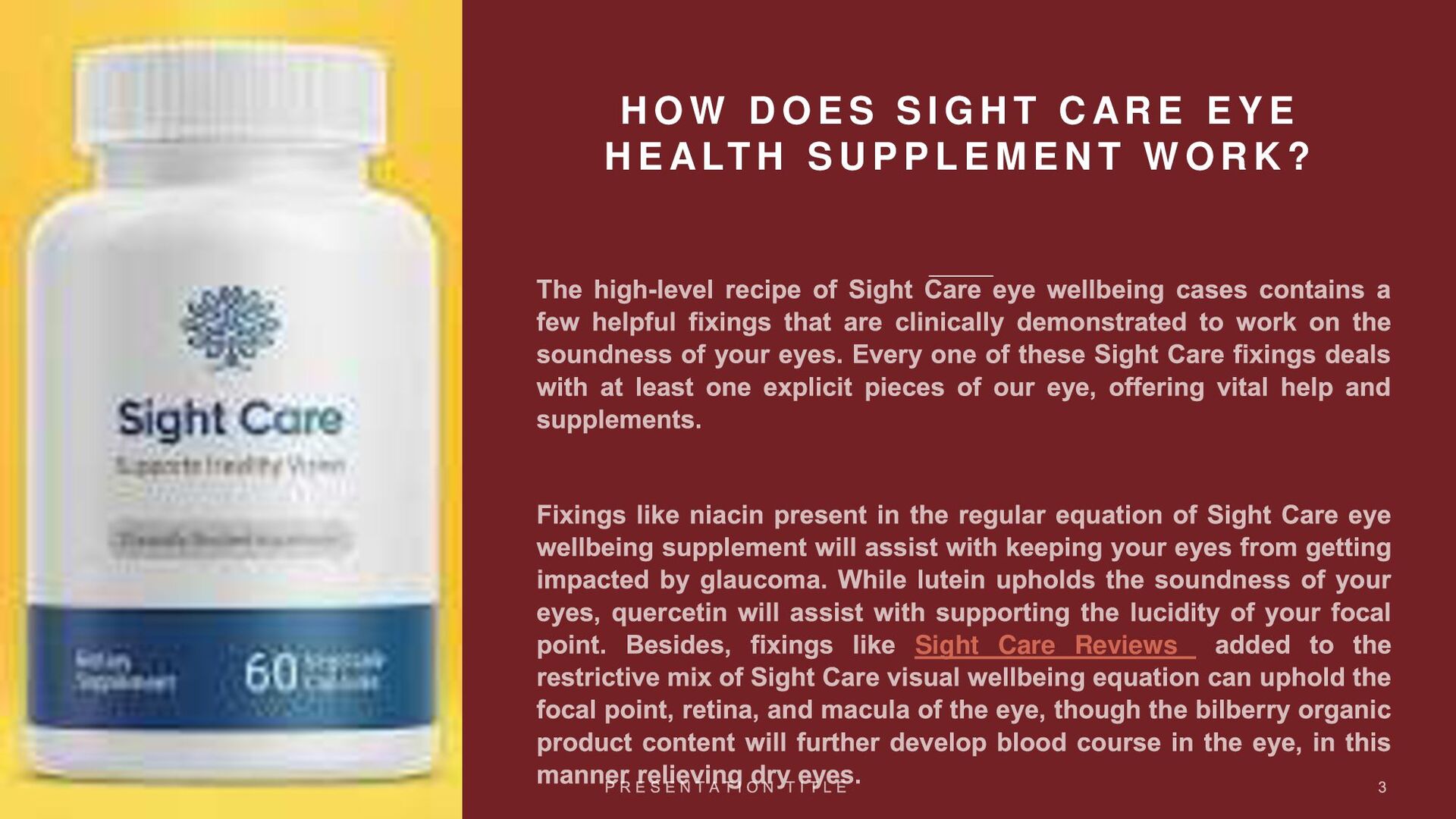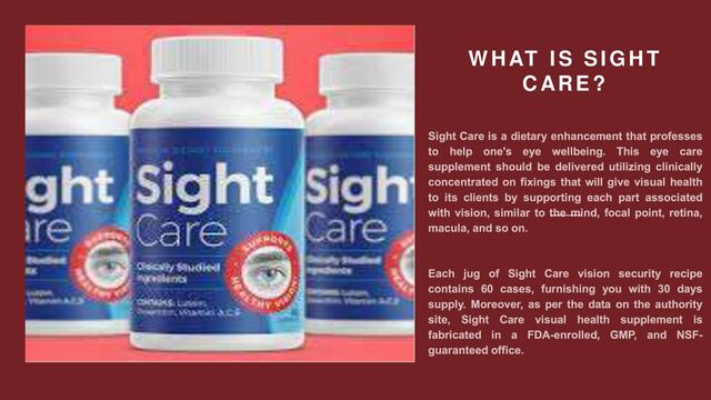 Sight Care is an eye care supplement that is intended to help a singular's eye wellbeing normally. The recipe of this eye wellbeing supplement contains a few clinically concentrated on fixings. It will successfully uphold one's cerebrum wellbeing, increment cancer prevention agents in the body, and subsequently assist one with keeping up with durable great vision. Keep perusing this Sight Care survey for additional fascinating subtleties of this enhancement.