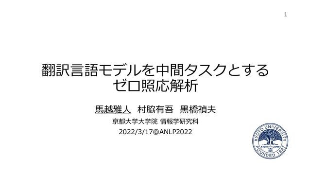 ⾺越雅⼈ 村脇有吾 ⿊橋禎夫 京都⼤学⼤学院 情報学研究科 2022/3/17@ANLP2022 1 翻訳⾔語モデルを中間タスクとする ゼロ照応解析