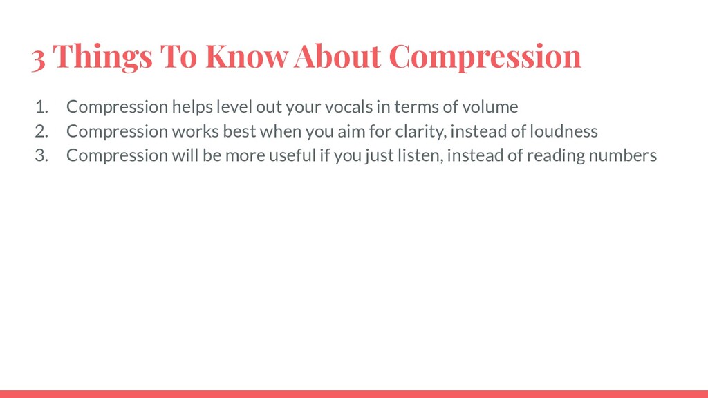 out your vocals in terms of volume 2. Compression works best when you aim for clarity, instead of loudness 3. Compression will be more useful if you just listen, instead of reading numbers
