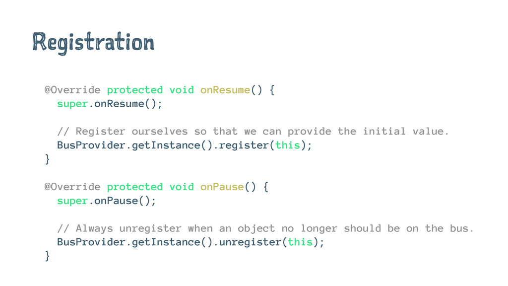 so that we can provide the initial value. BusProvider.getInstance().register(this); } @Override protected void onPause() { super.onPause(); // Always unregister when an object no longer should be on the bus. BusProvider.getInstance().unregister(this); }