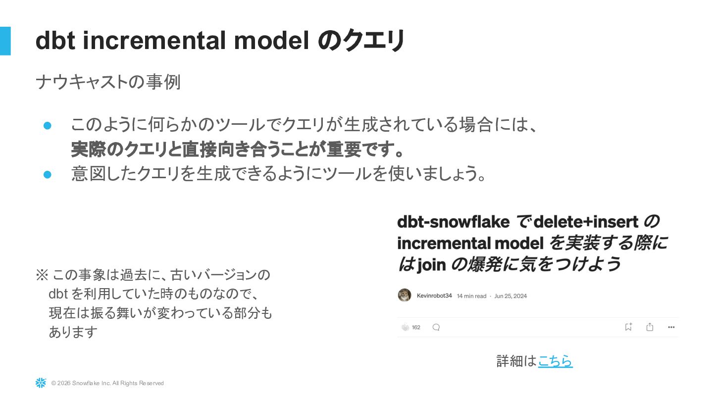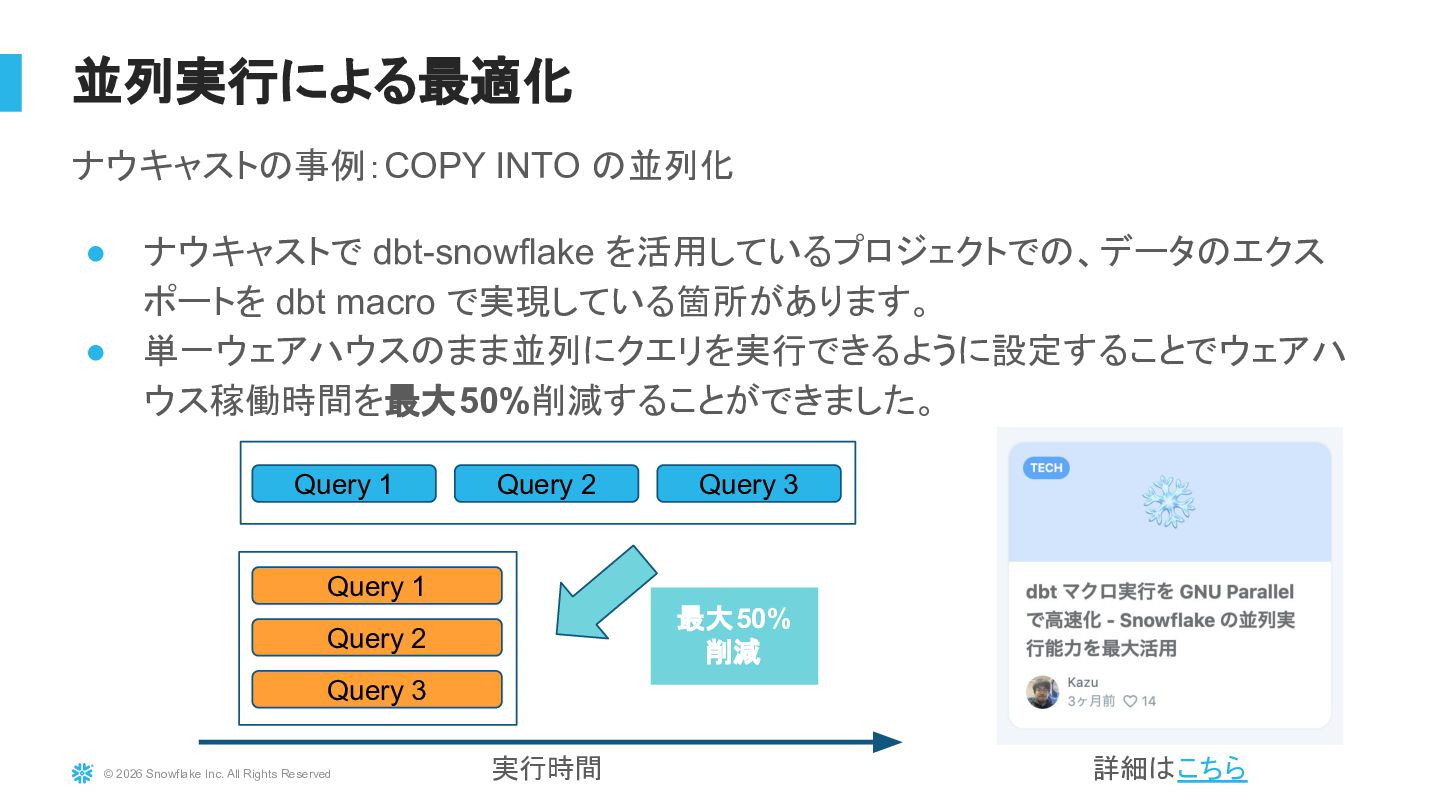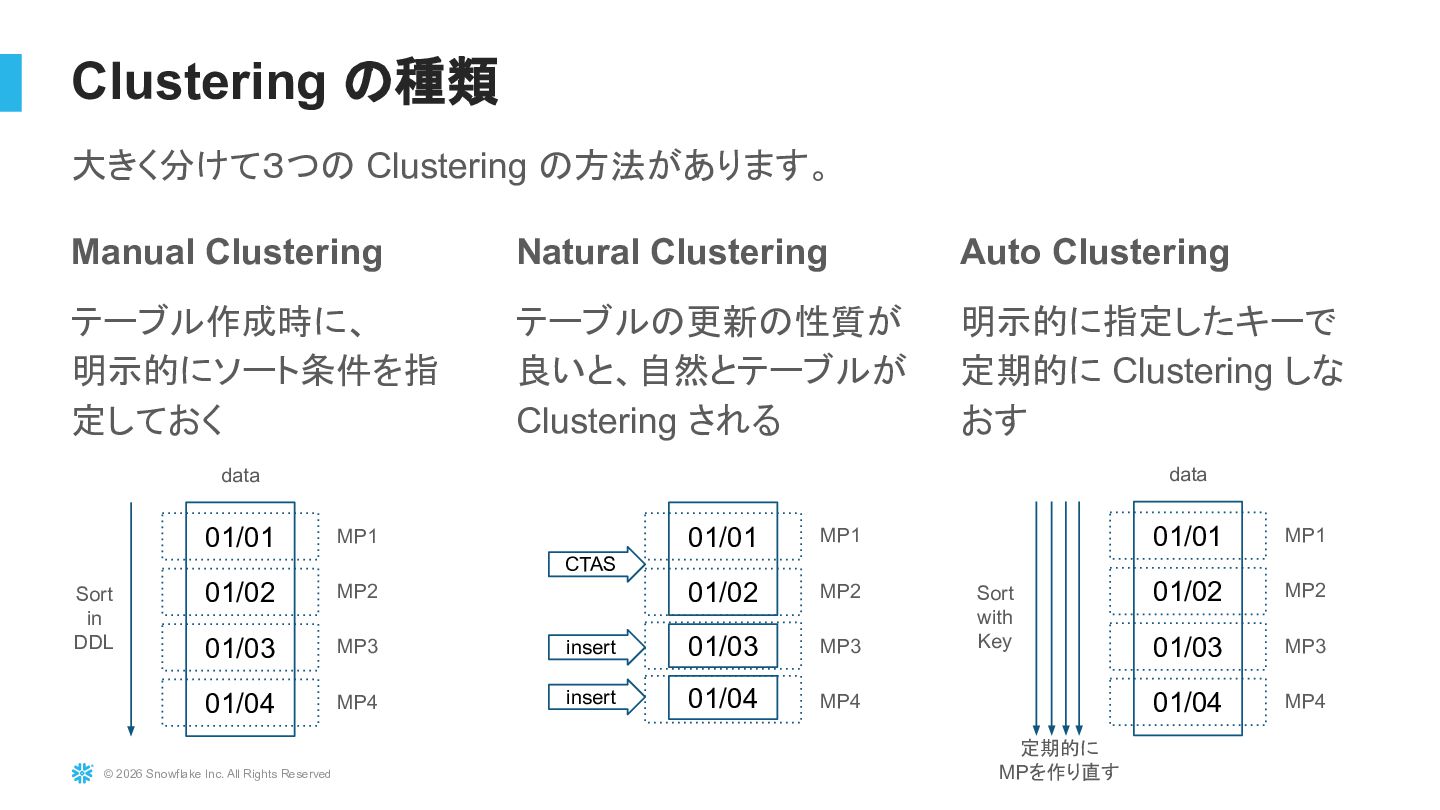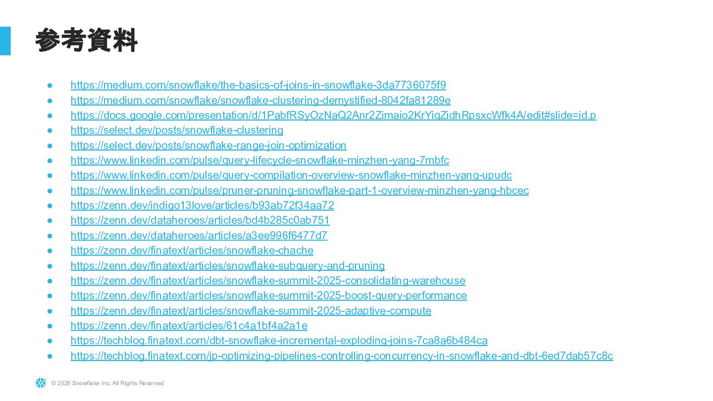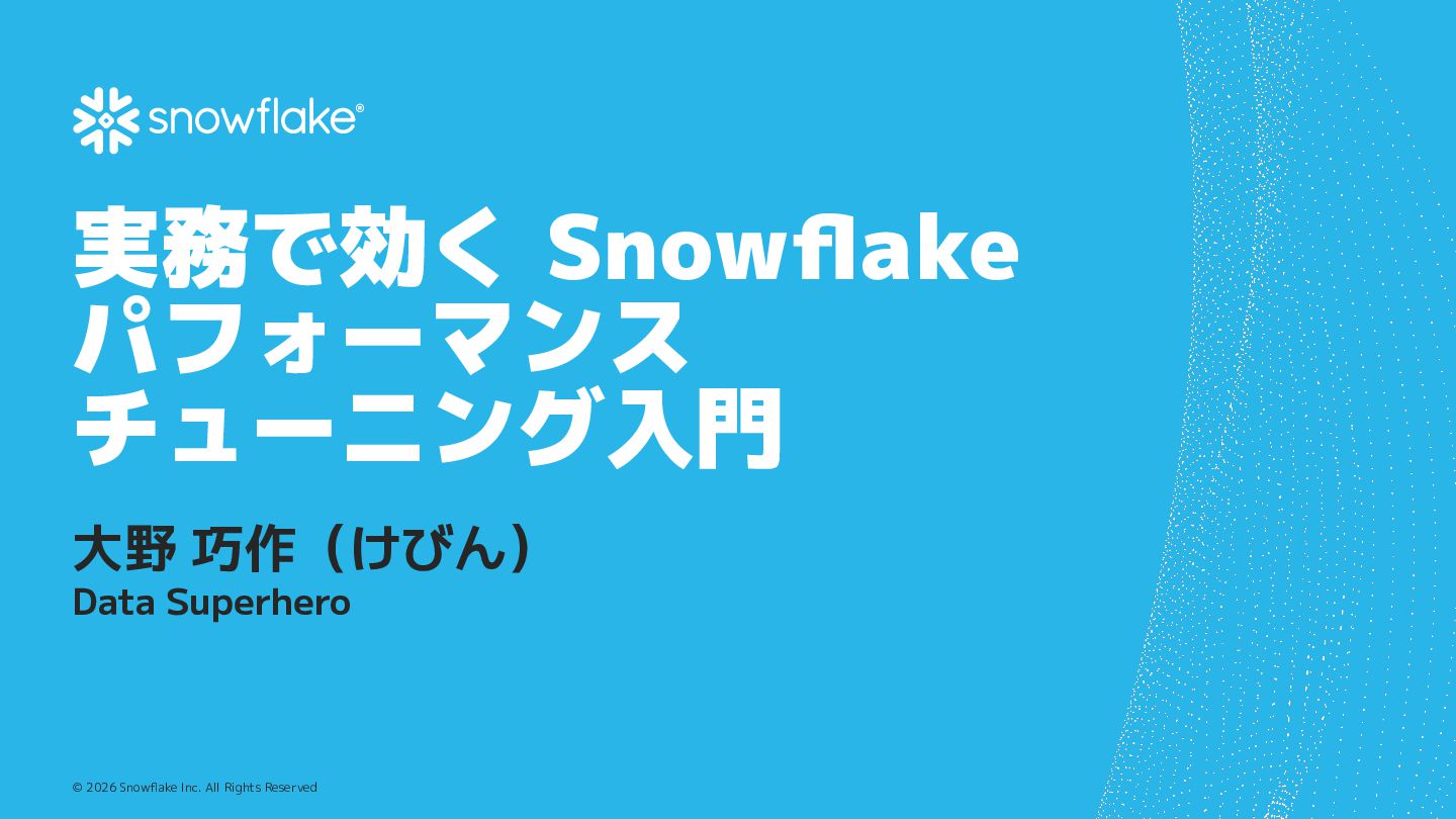 Snowflakeは基本的に自動最適化が強力なDWHですが、設計やクエリの書き方、Warehouseの使い方によって性能やコストは大きく変わります。本セッションでは、実務でよく遭遇する「クエリが遅い」「コストが増えた」といった課題を題材に、Query Profileの見方、クラスタリングやパーティション設計の考え方、Warehouse設定の基本、dbtと組み合わせて使う際の話など、パフォーマンス改善のためにまず押さえるべきポイントを整理して解説します。明日から使える実践的な考え方を中心に紹介します。