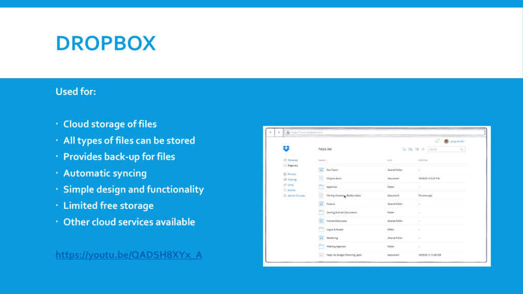 types of files can be stored Provides back-up for files Automatic syncing Simple design and functionality Limited free storage Other cloud services available https://youtu.be/QADSH8XYx_A