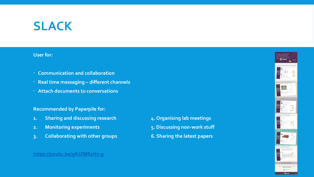 messaging – different channels Attach documents to conversations Recommended by Paperpile for: 1. Sharing and discussing research 4. Organising lab meetings 2. Monitoring experiments 5. Discussing non-work stuff 3. Collaborating with other groups 6. Sharing the latest papers https://youtu.be/9RJZMSsH7-g