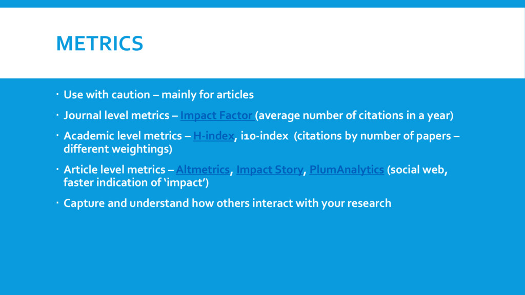 Journal level metrics – Impact Factor (average number of citations in a year) Academic level metrics – H-index, i10-index (citations by number of papers – different weightings) Article level metrics – Altmetrics, Impact Story, PlumAnalytics (social web, faster indication of ‘impact’) Capture and understand how others interact with your research