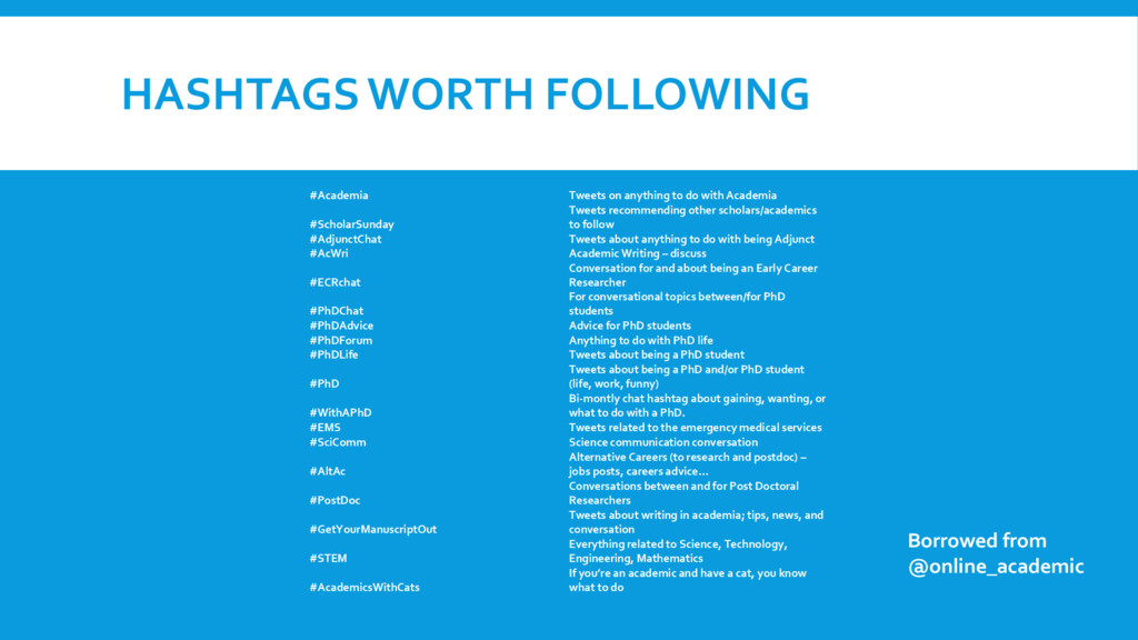 Academia #ScholarSunday Tweets recommending other scholars/academics to follow #AdjunctChat Tweets about anything to do with being Adjunct #AcWri Academic Writing – discuss #ECRchat Conversation for and about being an Early Career Researcher #PhDChat For conversational topics between/for PhD students #PhDAdvice Advice for PhD students #PhDForum Anything to do with PhD life #PhDLife Tweets about being a PhD student #PhD Tweets about being a PhD and/or PhD student (life, work, funny) #WithAPhD Bi-montly chat hashtag about gaining, wanting, or what to do with a PhD. #EMS Tweets related to the emergency medical services #SciComm Science communication conversation #AltAc Alternative Careers (to research and postdoc) – jobs posts, careers advice… #PostDoc Conversations between and for Post Doctoral Researchers #GetYourManuscriptOut Tweets about writing in academia; tips, news, and conversation #STEM Everything related to Science, Technology, Engineering, Mathematics #AcademicsWithCats If you’re an academic and have a cat, you know what to do Borrowed from @online_academic