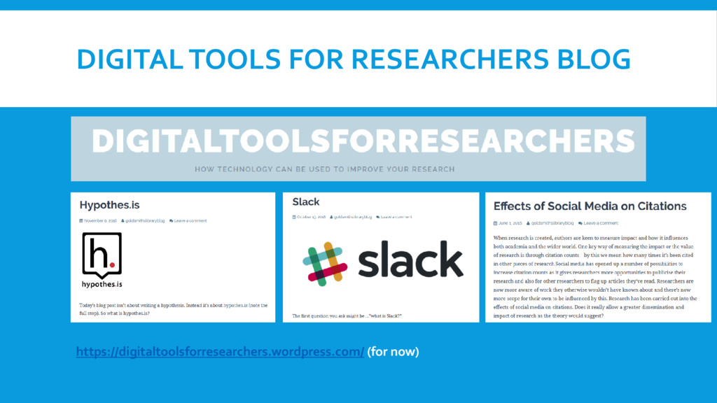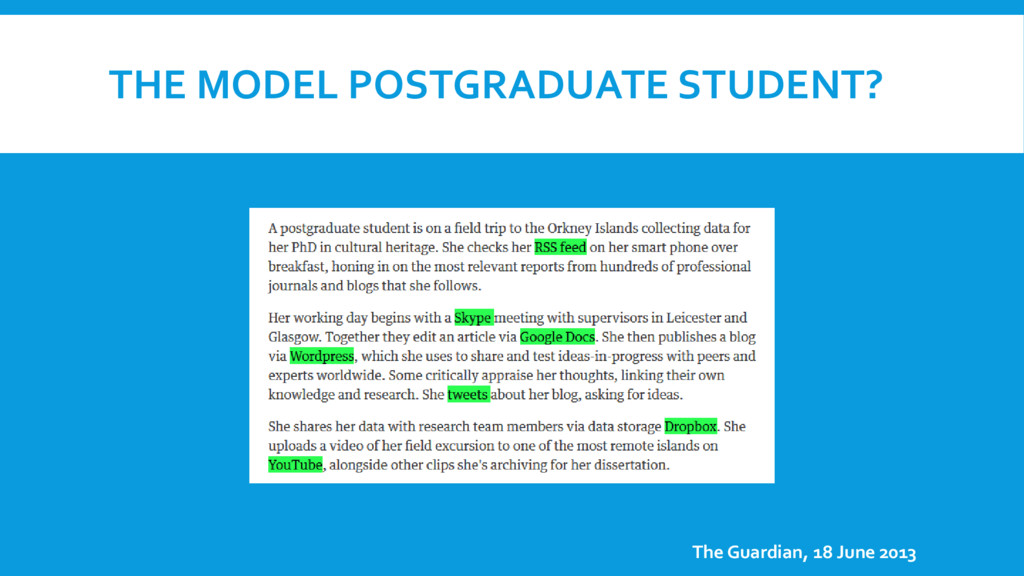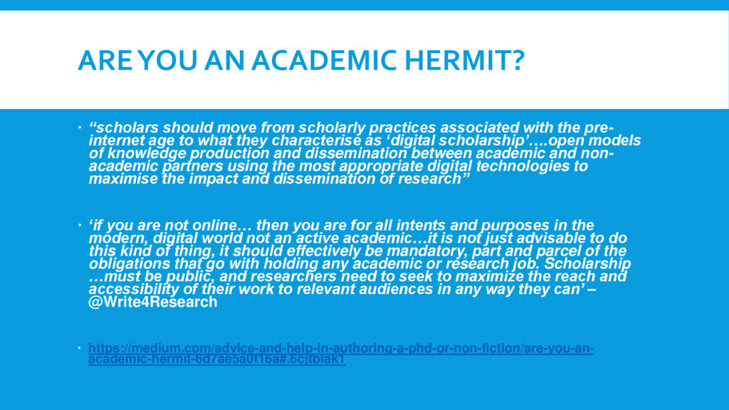 scholarly practices associated with the pre- internet age to what they characterise as ‘digital scholarship’….open models of knowledge production and dissemination between academic and non- academic partners using the most appropriate digital technologies to maximise the impact and dissemination of research” ‘if you are not online… then you are for all intents and purposes in the modern, digital world not an active academic…it is not just advisable to do this kind of thing, it should effectively be mandatory, part and parcel of the obligations that go with holding any academic or research job. Scholarship …must be public, and researchers need to seek to maximize the reach and accessibility of their work to relevant audiences in any way they can’ – @Write4Research https://medium.com/advice-and-help-in-authoring-a-phd-or-non-fiction/are-you-an- academic-hermit-6d7ae5a0f16a#.6cjtblak1